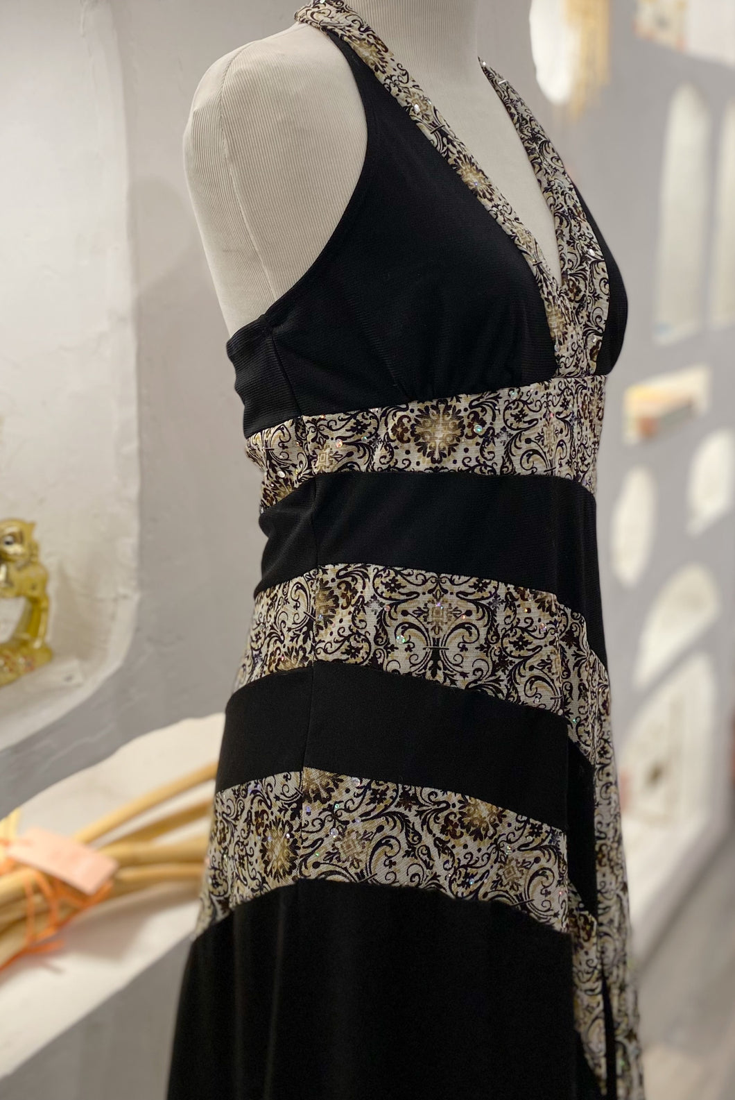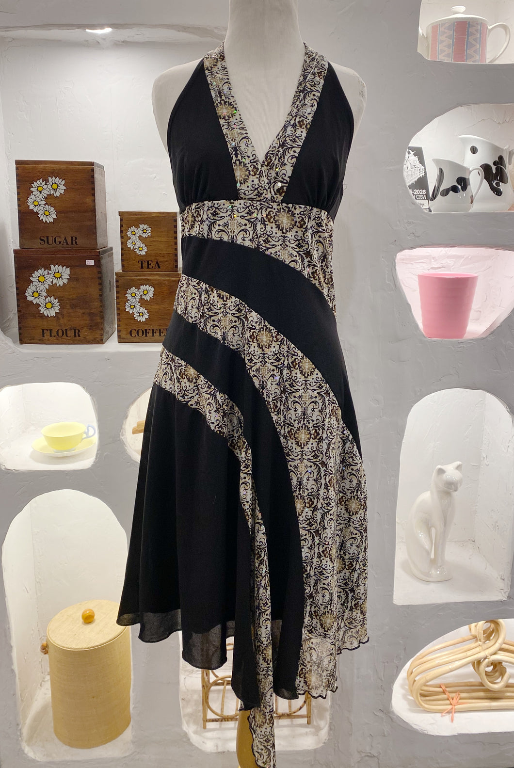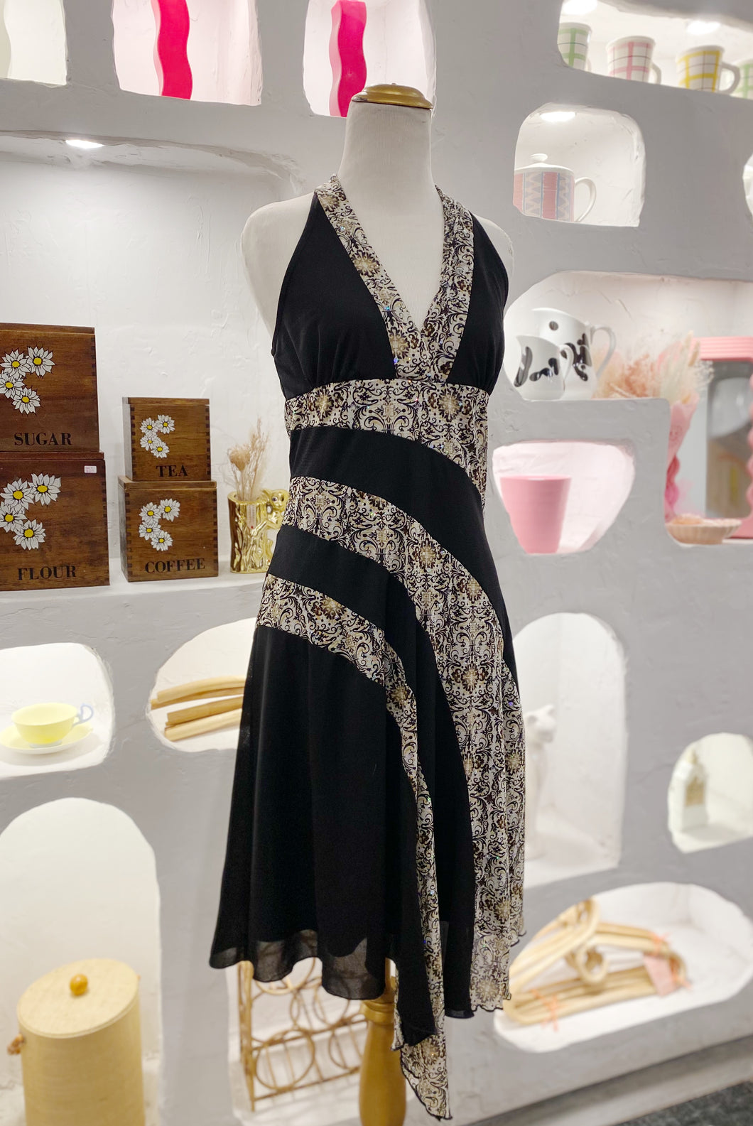 Y2K vintage flower striped halter dress with asymmetrical hem by BCX. Patterned fabric has some sequins. Made in USA. Tagged as a size large but fits a bit smaller.