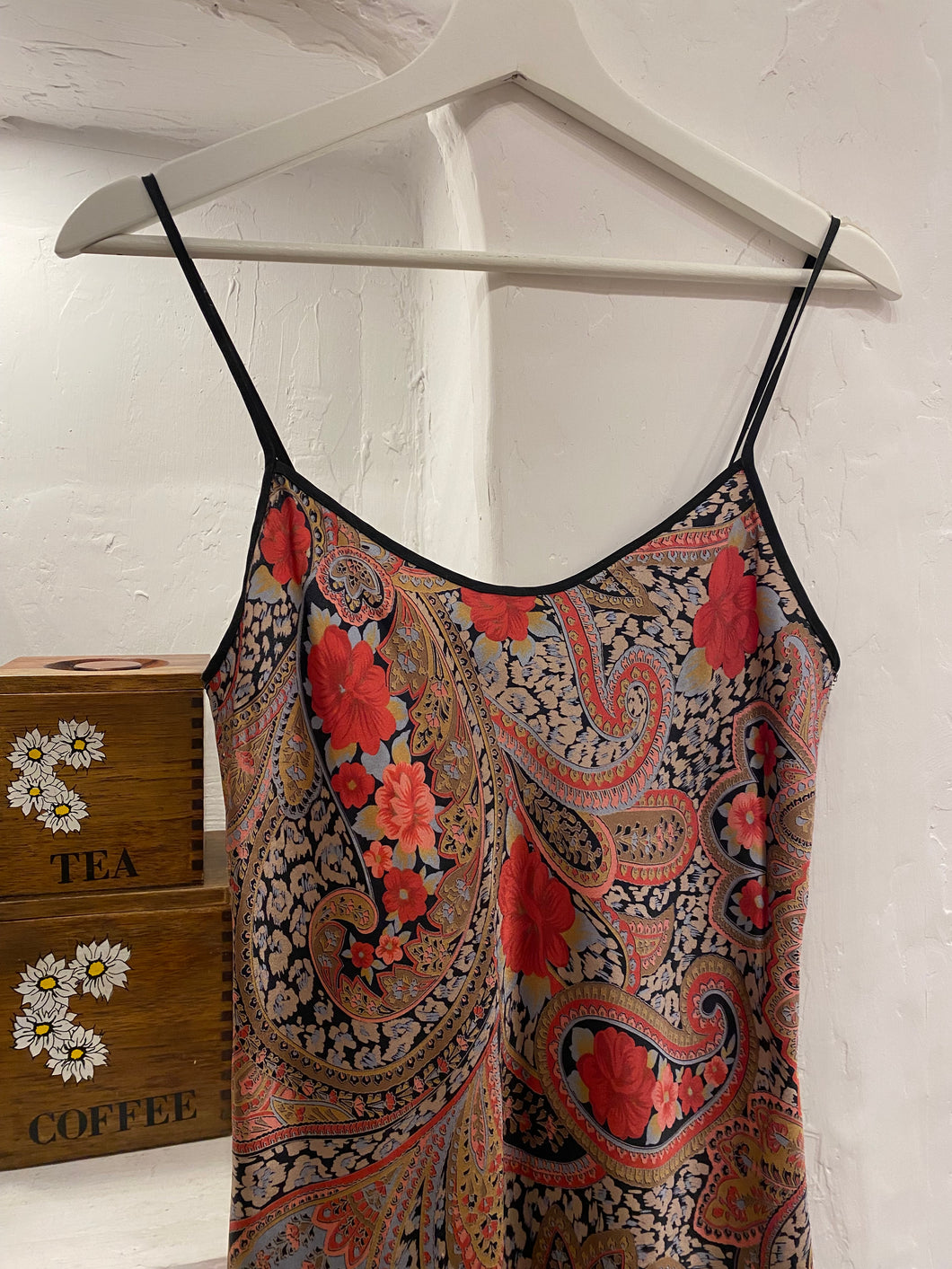 Vintage paisley satin slip dress by French Maid. No materials tags - likely polyester. Best suits size XS-S.
