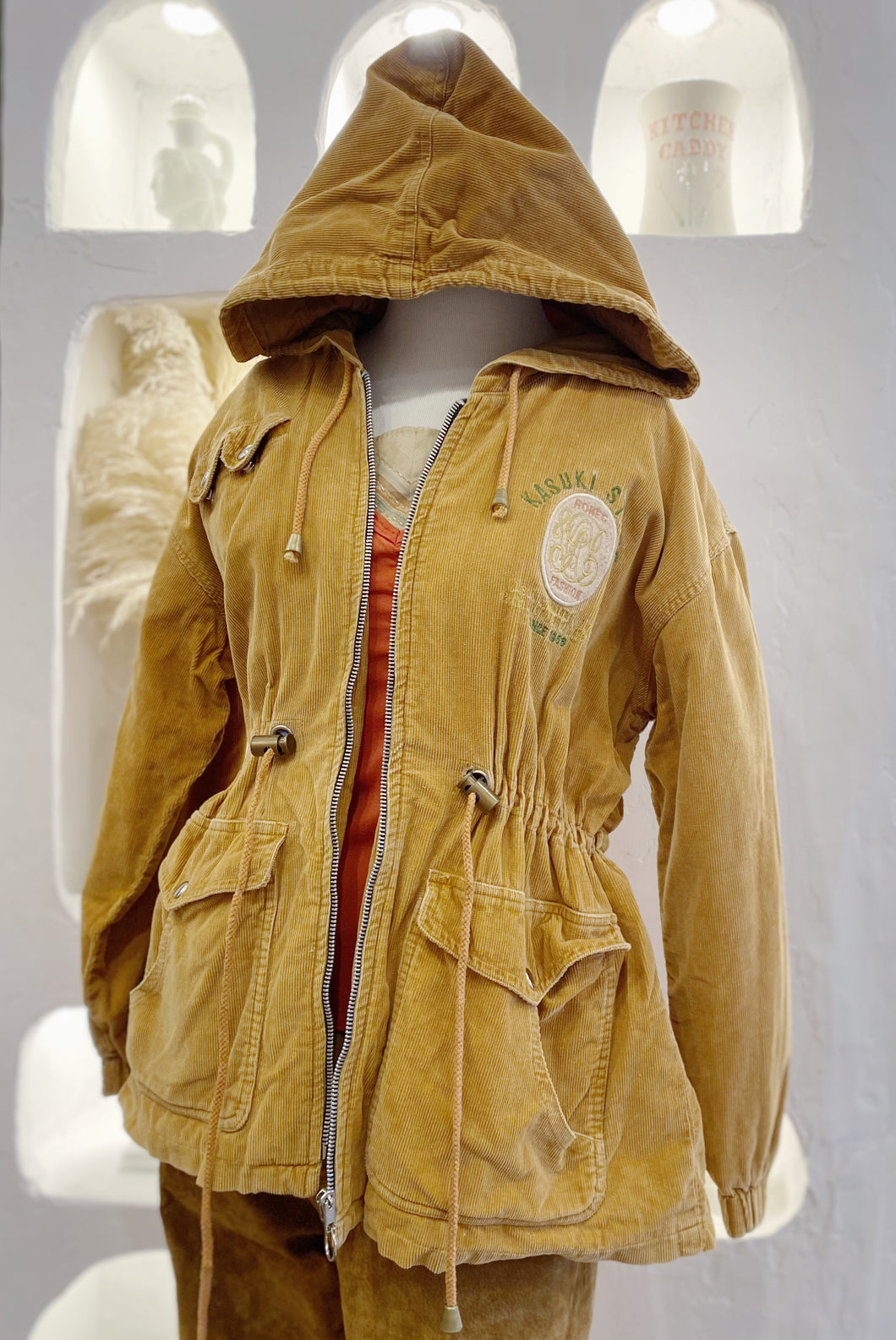 Retro hooded corduroy jacket with patch & embroidery that reads: “Kasuki Staff/Kasuki is on the point of revolutionizing the world since 1966”. Has multiple pockets on outside and adjustable waist. Approximately size large. No materials tag.