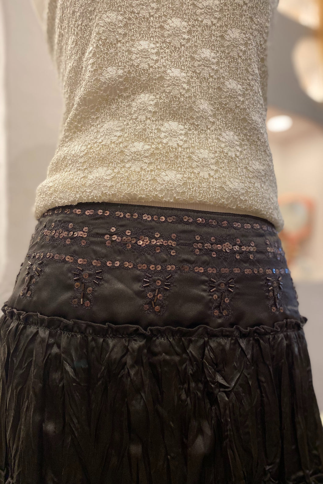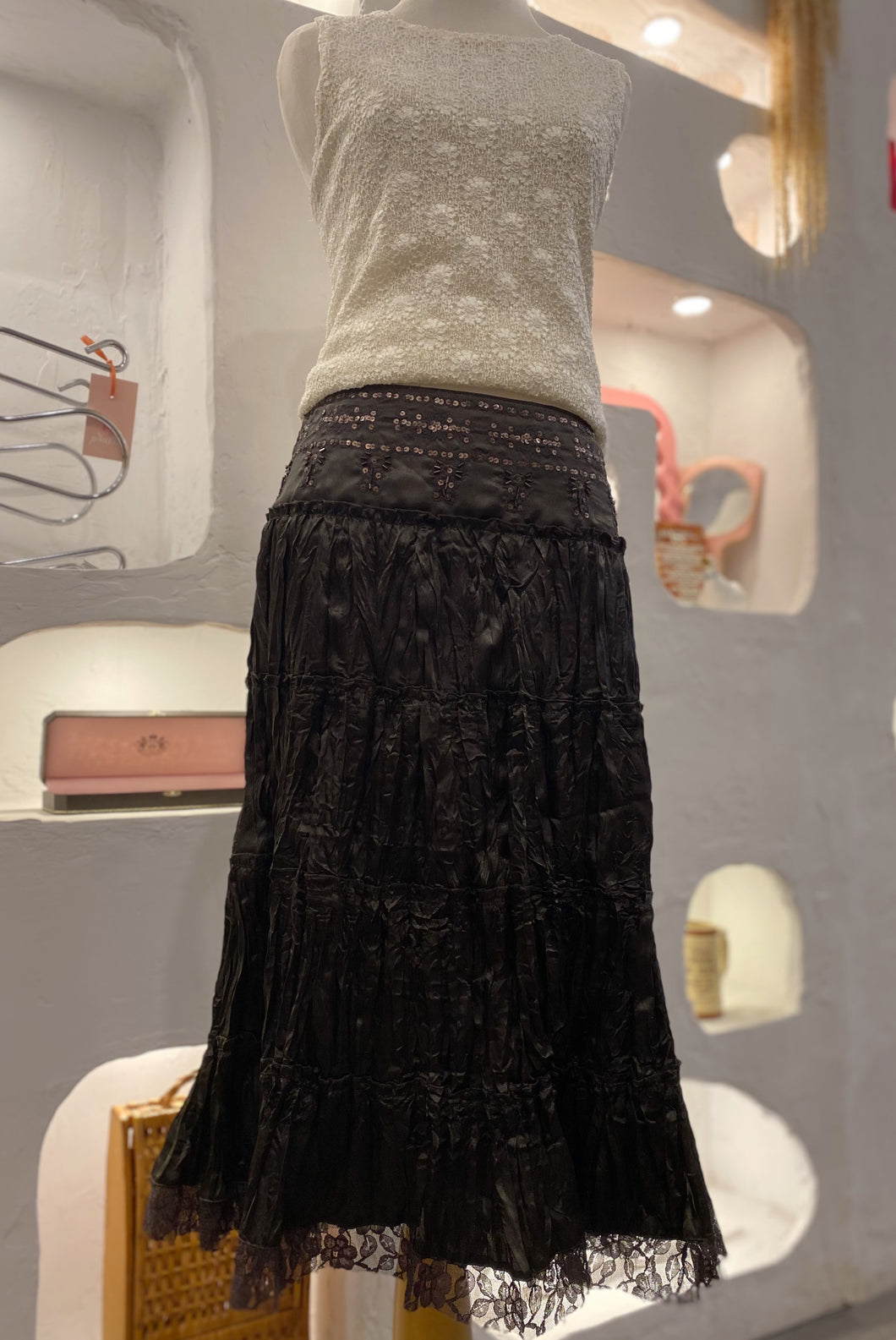 Y2K Suzy Shier dark brown midi skirt with sequinned waist and lace trim. No sequins on back. Zipper on side. Made in China. Labelled as a size 7/8.