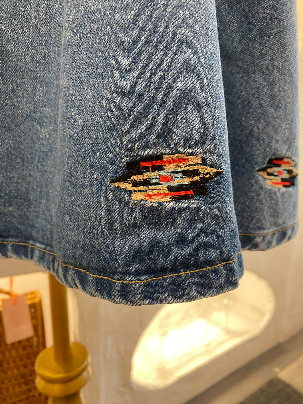 Retro denim circle skirt with front pockets & embroidered details by Wooz Original. Made in Taiwan.