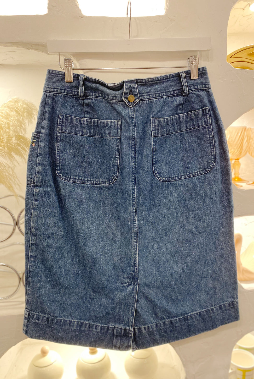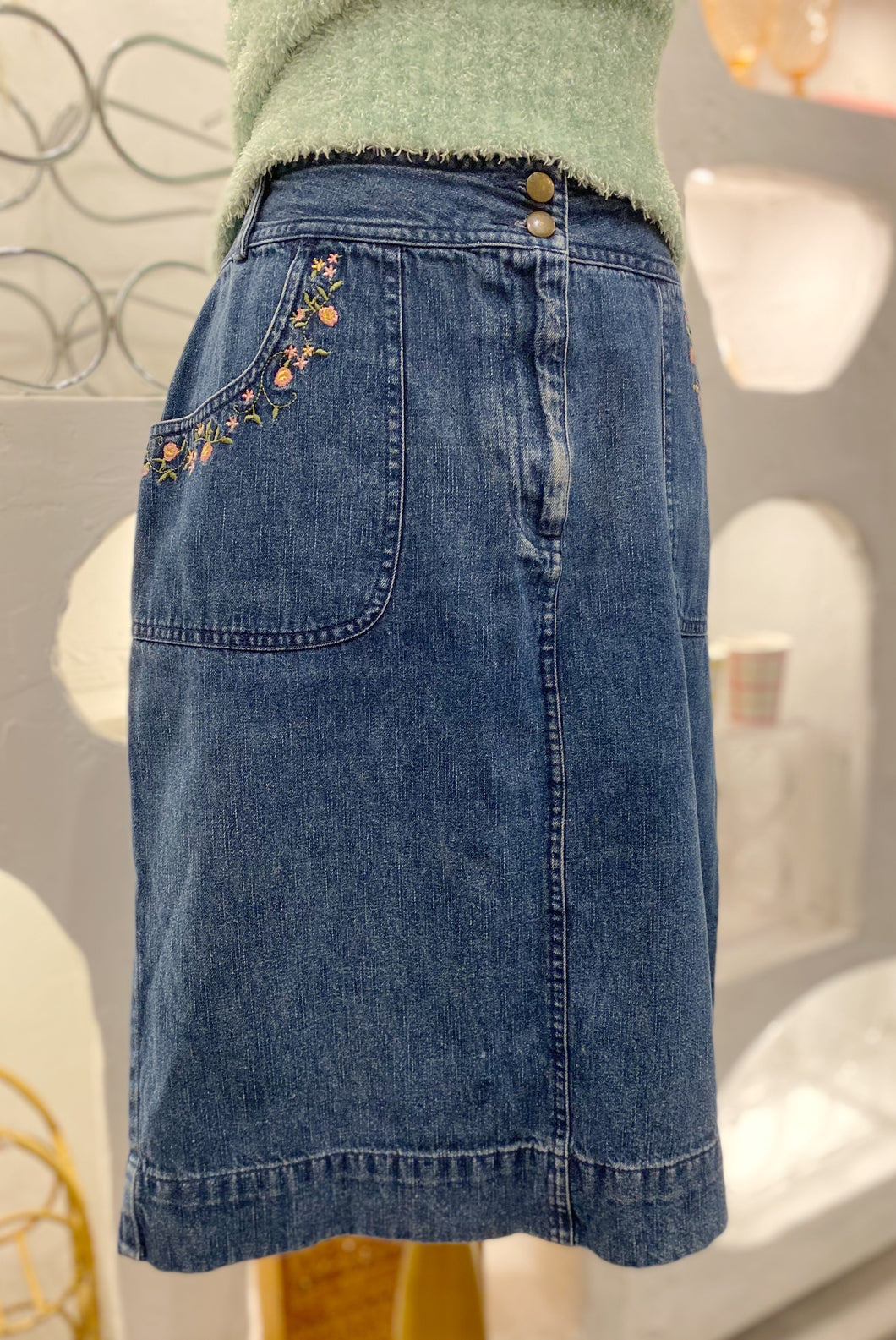 Vintage jean skirt with floral embroidery on pockets by Caroll Reed. Size 10. Made in Bangladesh.