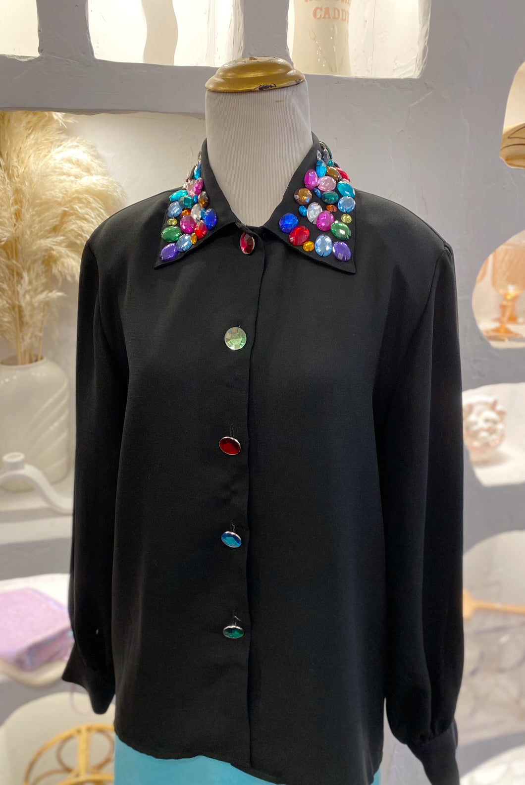 Retro black blouse with gems on collar and plastic jewel buttons by Braemar by Jeremy Scott. Made in Hong Kong. Size 10. Has light shoulder pads that would be easy to remove.