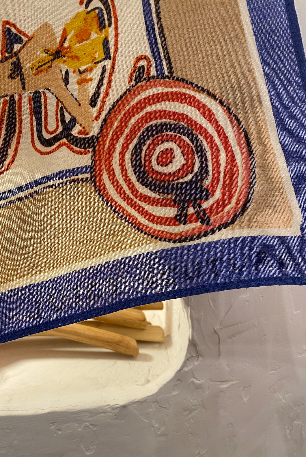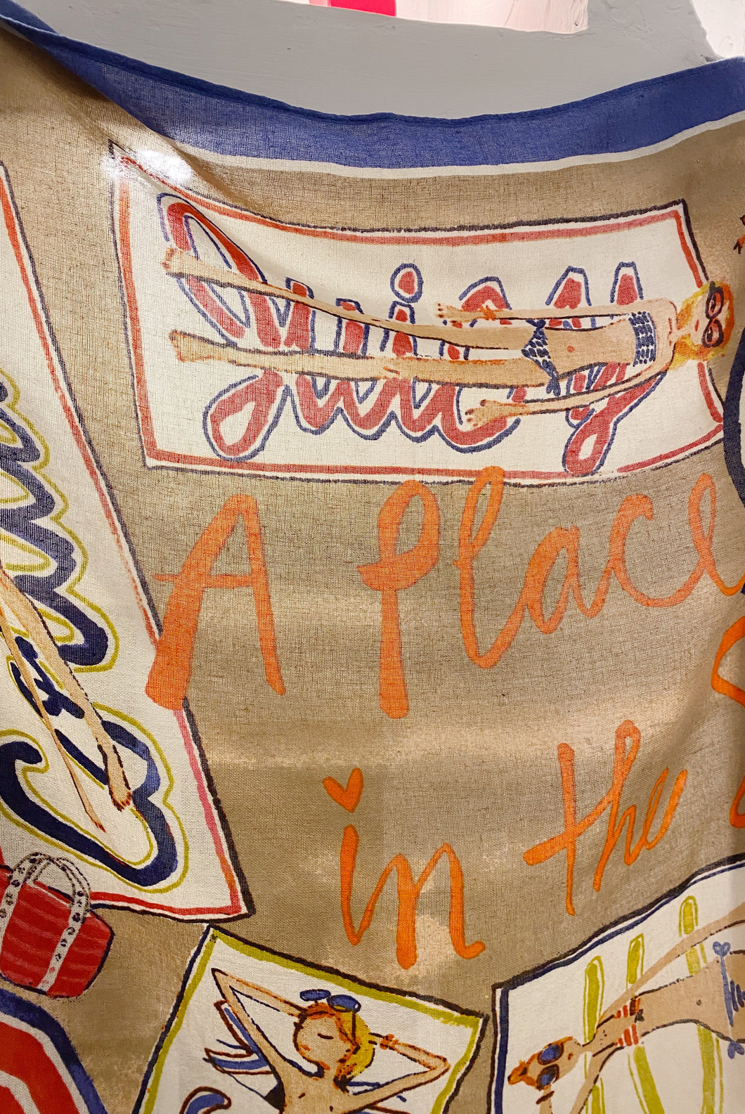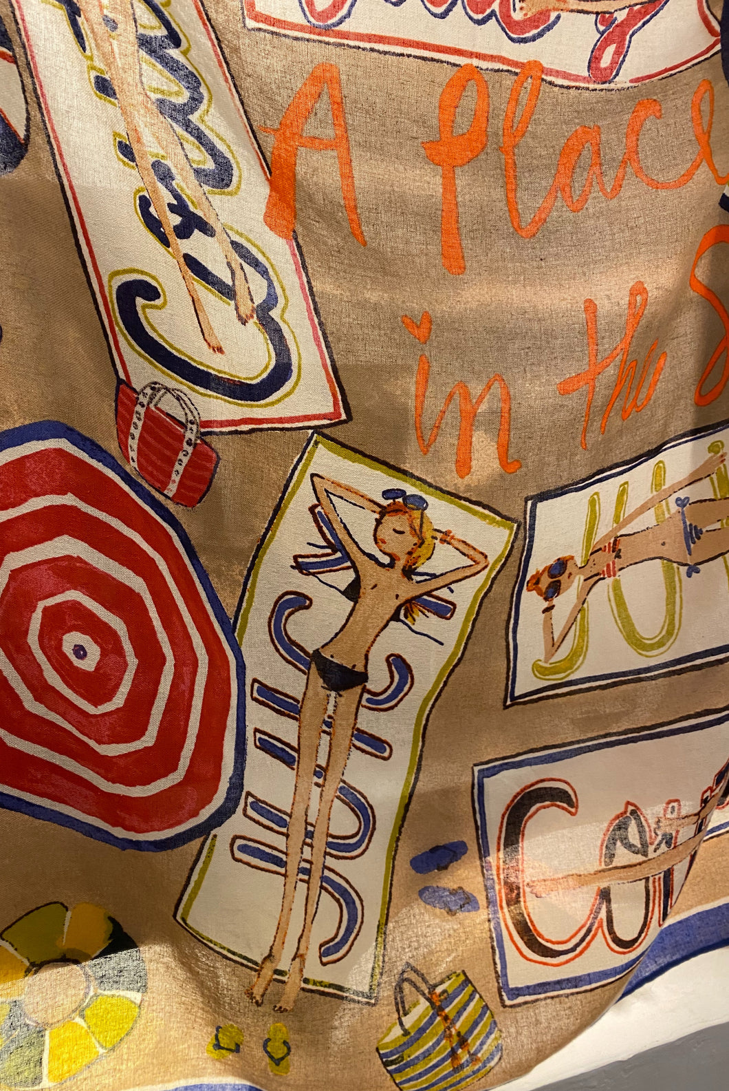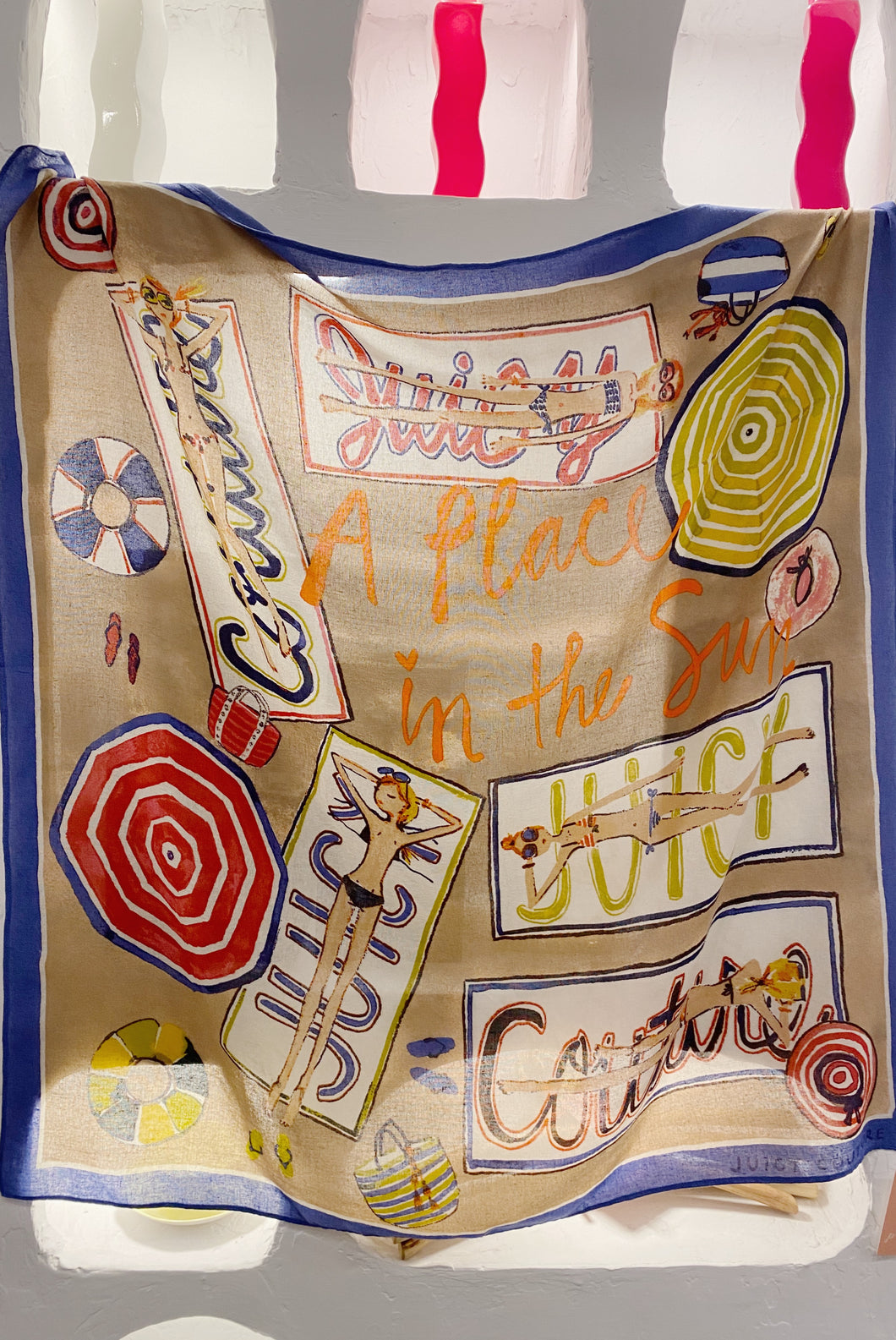 2010s Juicy Couture scarf illustrated by Sujean Rim. Reads ‘A place in the sun’. Raw silk.