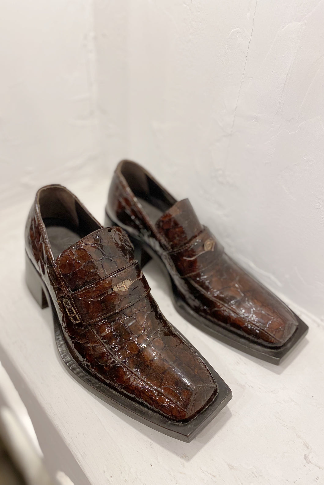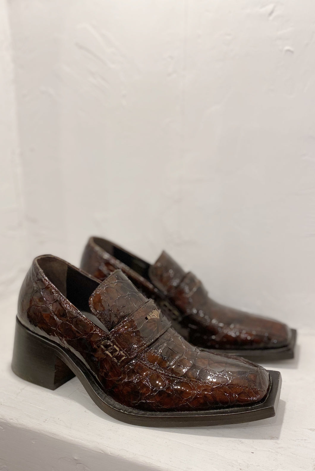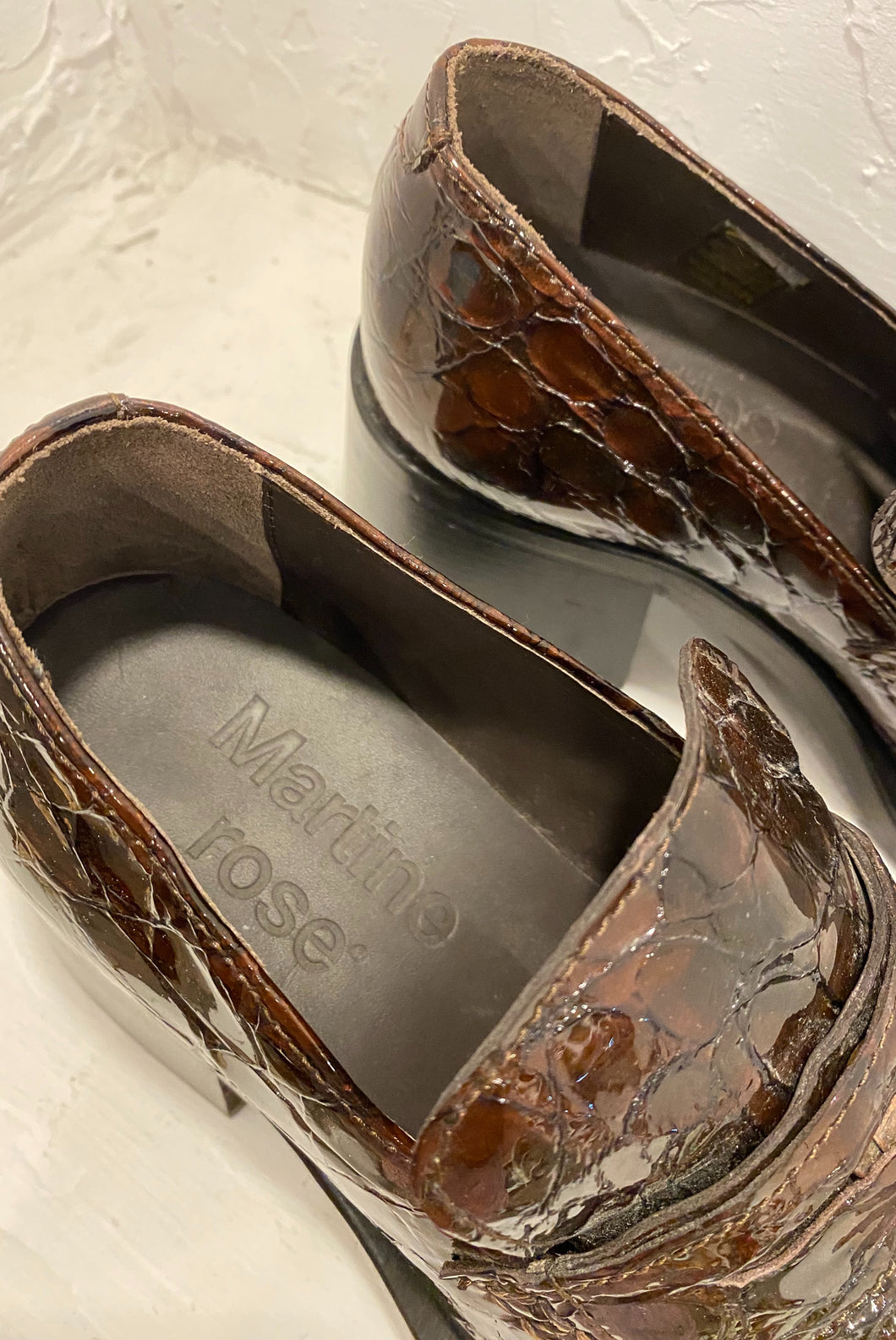 Martine Rose brown heeled loafers with croc embossed leather and square toes. Made in Portugal.