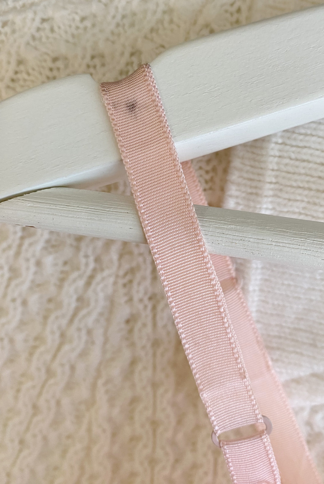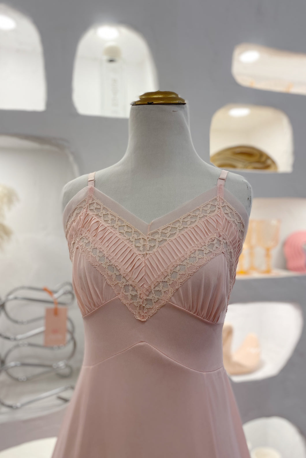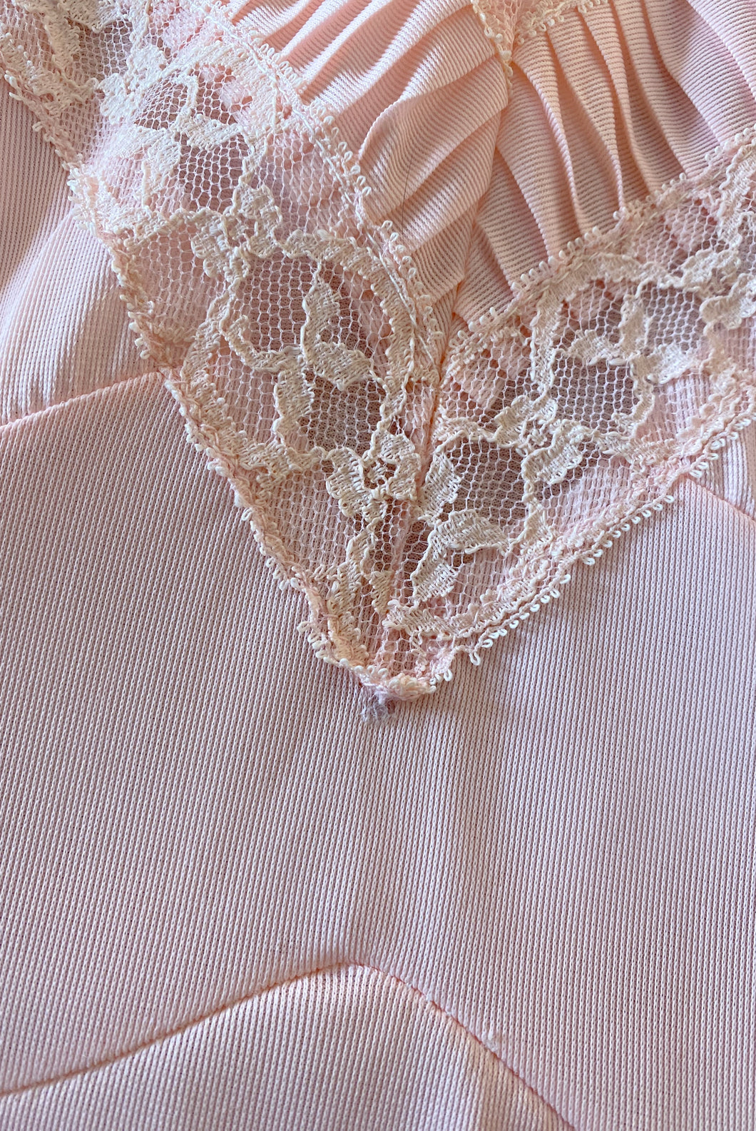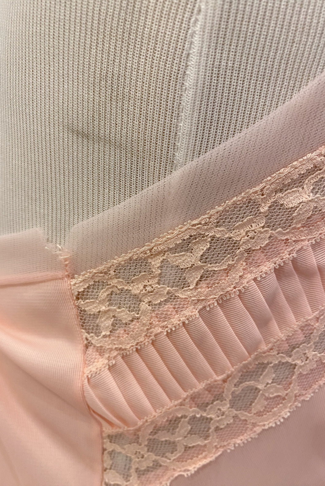 Vintage pink nylon & lace slip dress with adjustable straps and pleated hem. Size 34 (small).