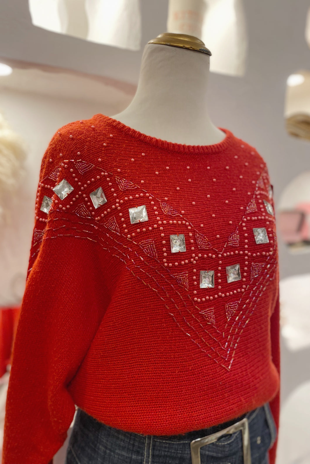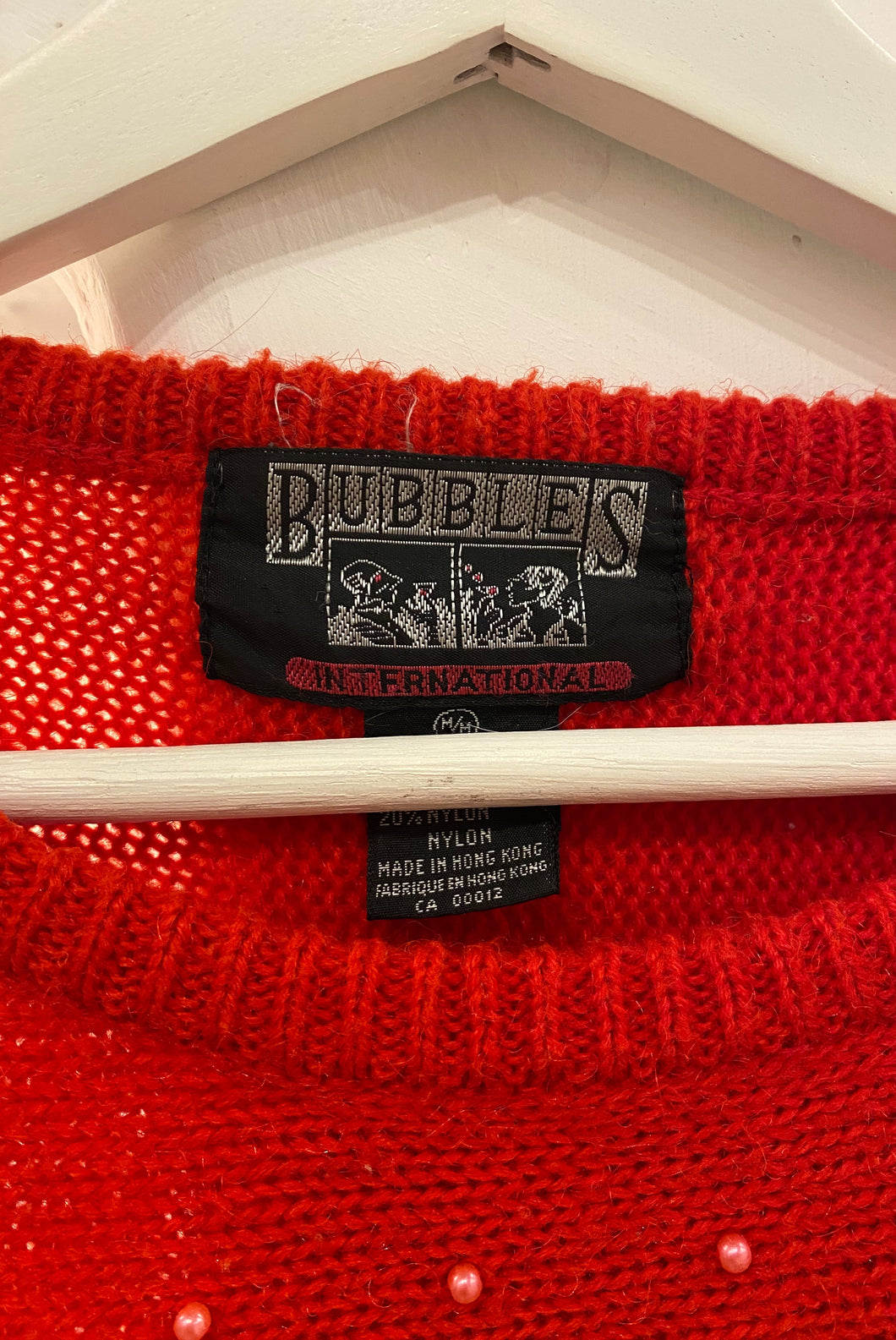 Retro knit cardigan with beaded and embellished details and dolman sleeves by Bubbles International. Made in Hong Kong. Size medium.