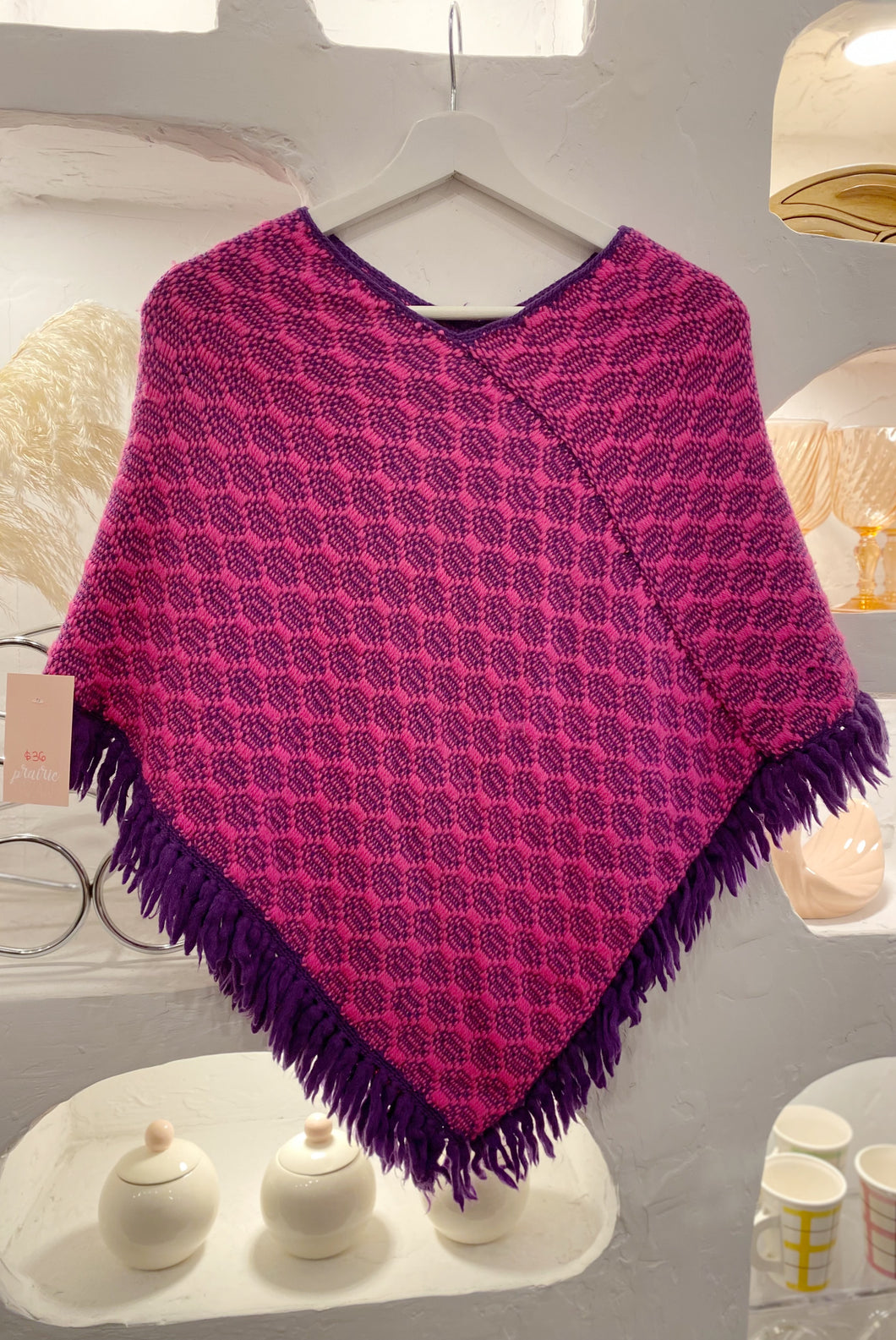 Vintage pink & purple knit poncho with purple wool fringe. Fits on the smaller side.