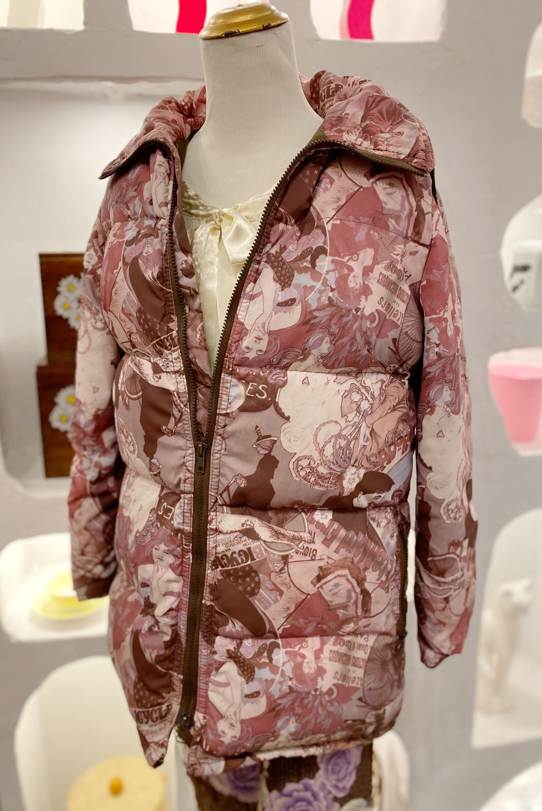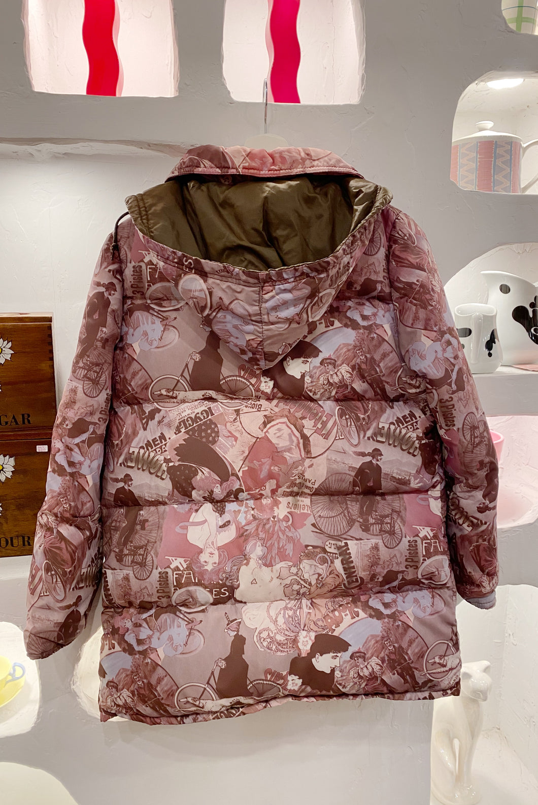 Vintage Paris themed hooded puffy coat by Fashion Gems. Large pockets on each side inside and zippered pockets on outside. Best suits size medium to large.