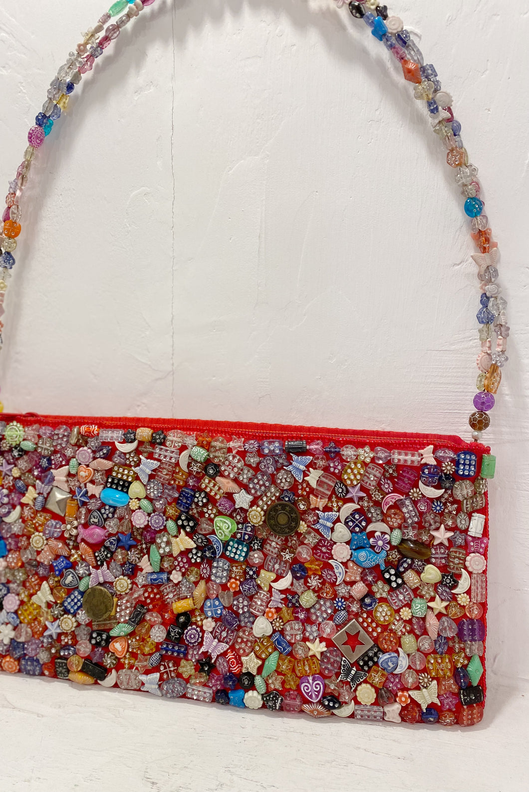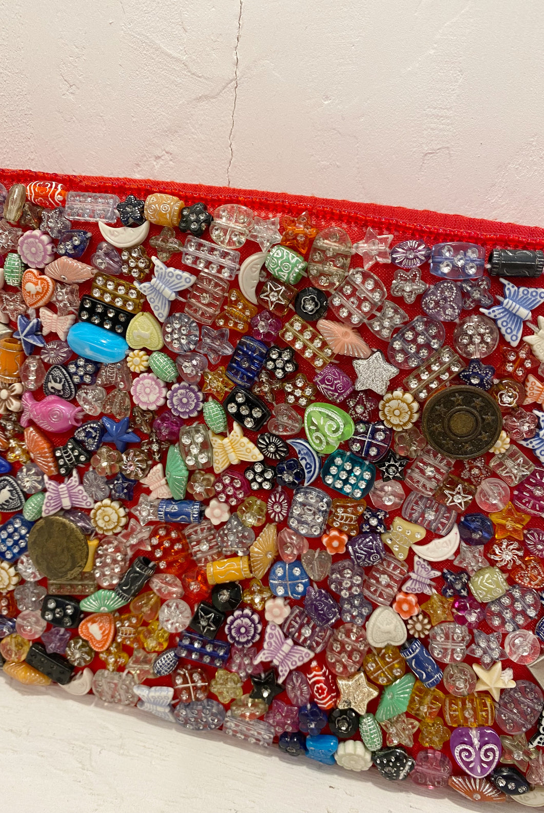 Vintage 90s “junk drawer” beaded red handbag with zipper closure. Backside is plain. Like new.
