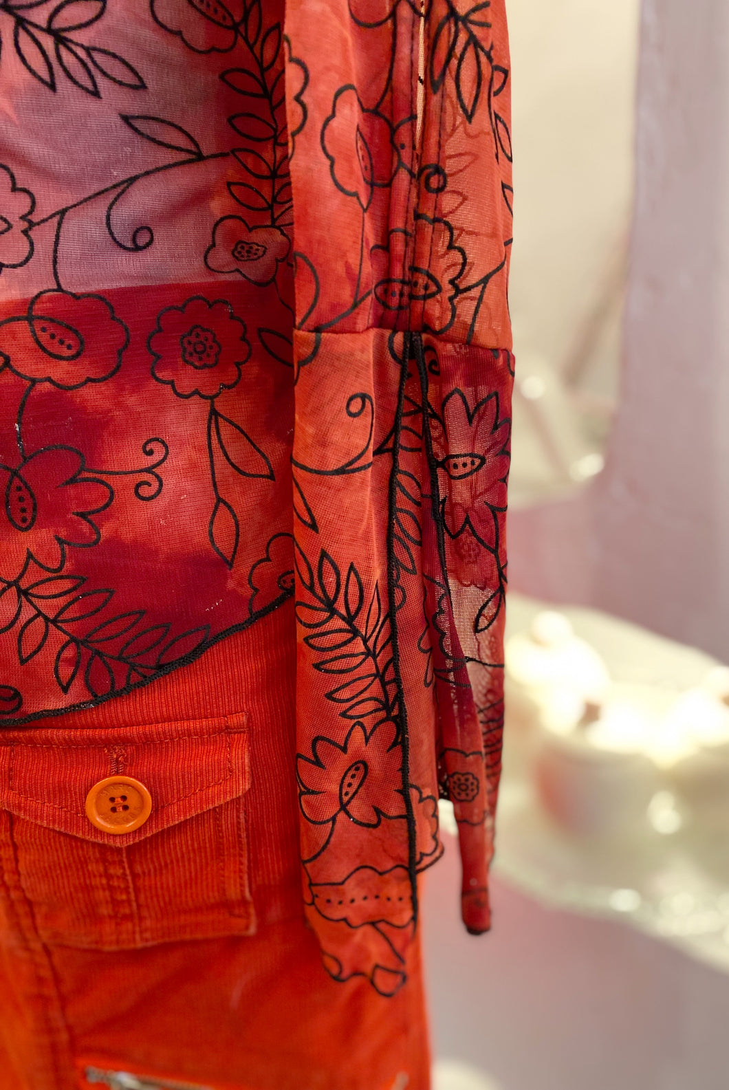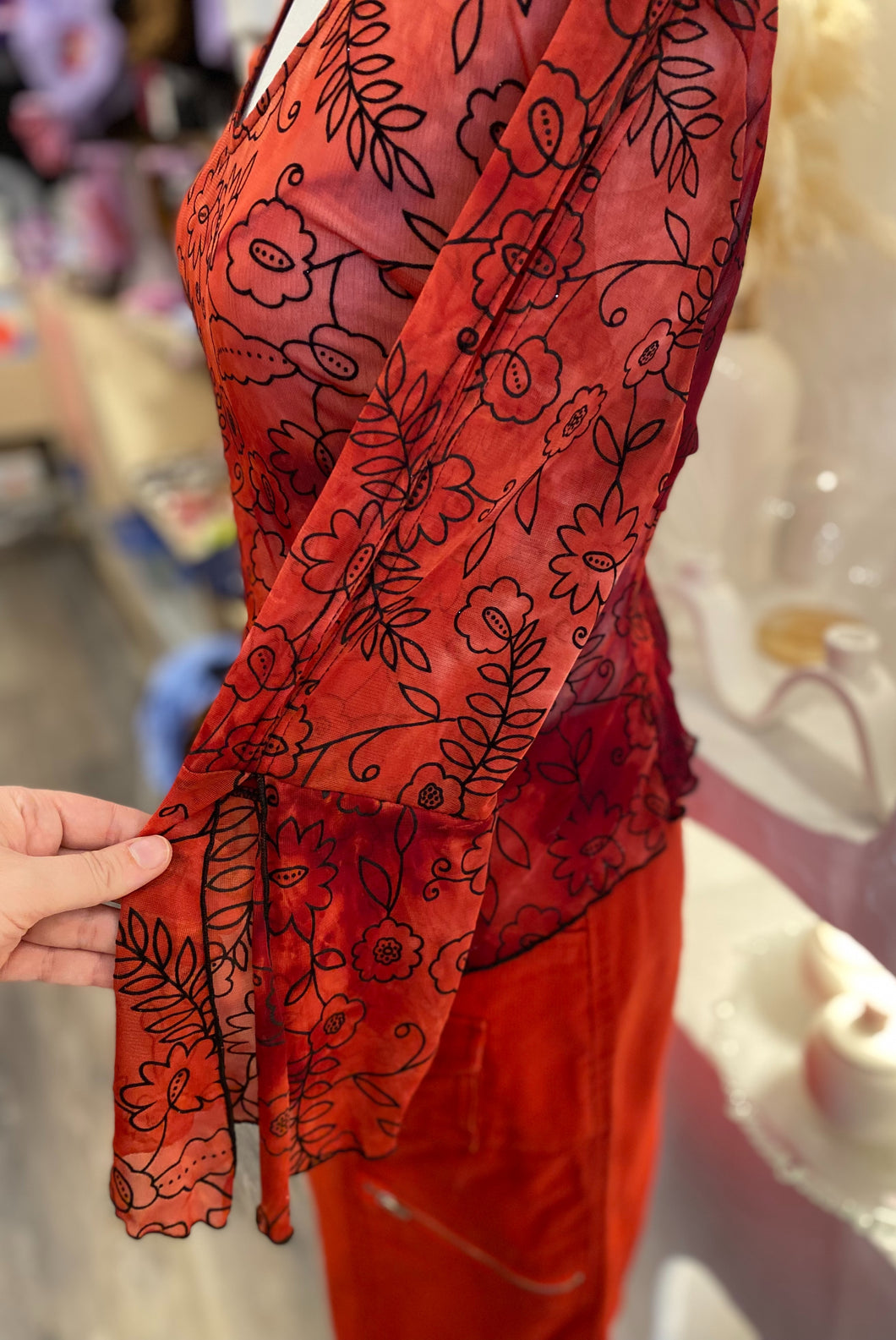 Y2K sheer red stretchy top with split sleeves and black raised floral pattern. Has pointed hem and split sleeves. There is some silver sparkles on black floral pattern. Best suits size large.