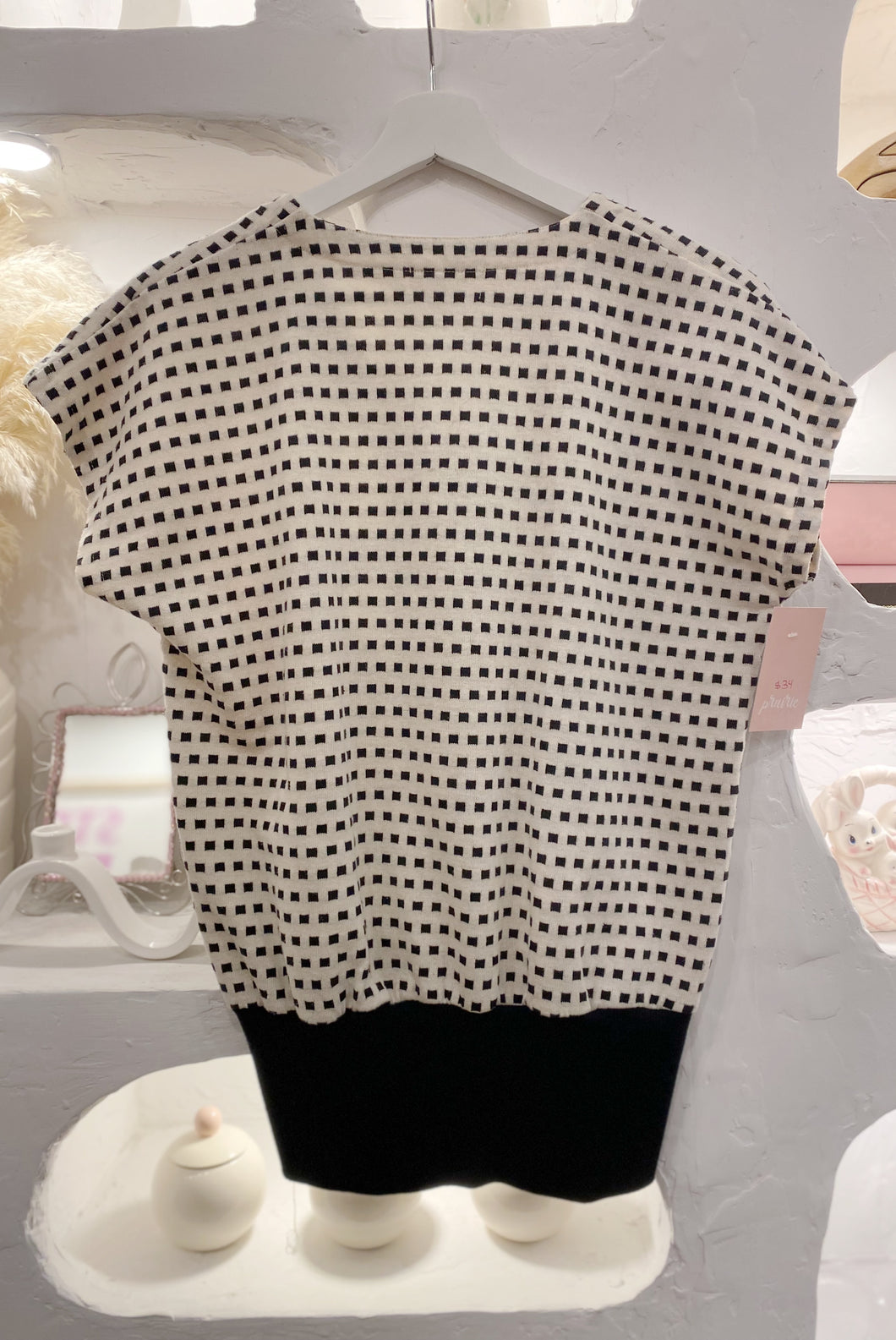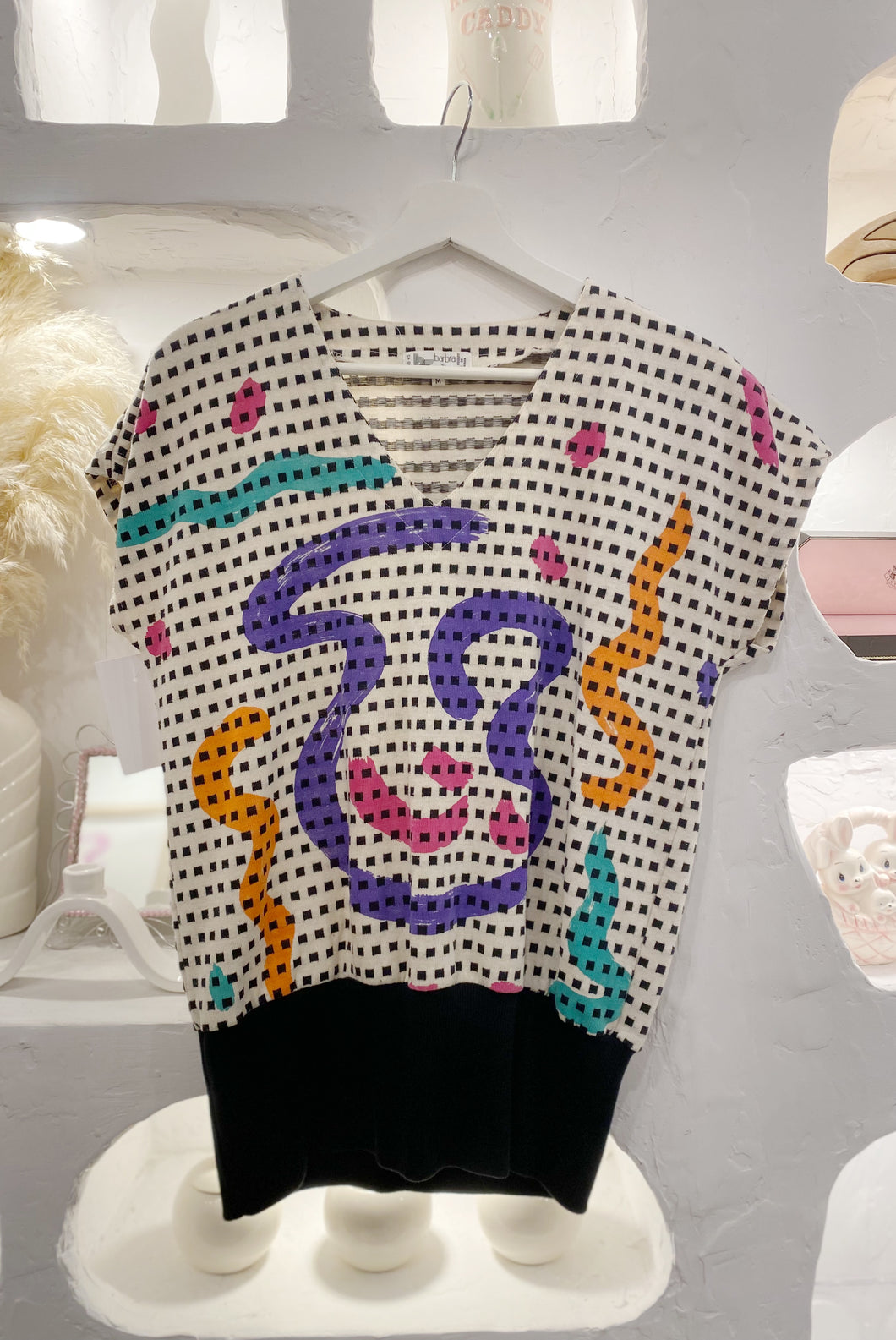 Retro 80s or 90s dotted top with colorful squiggles by Barbra Ts. Has cinched black waistband. Made in Taiwan. Size medium. No fabric tag.