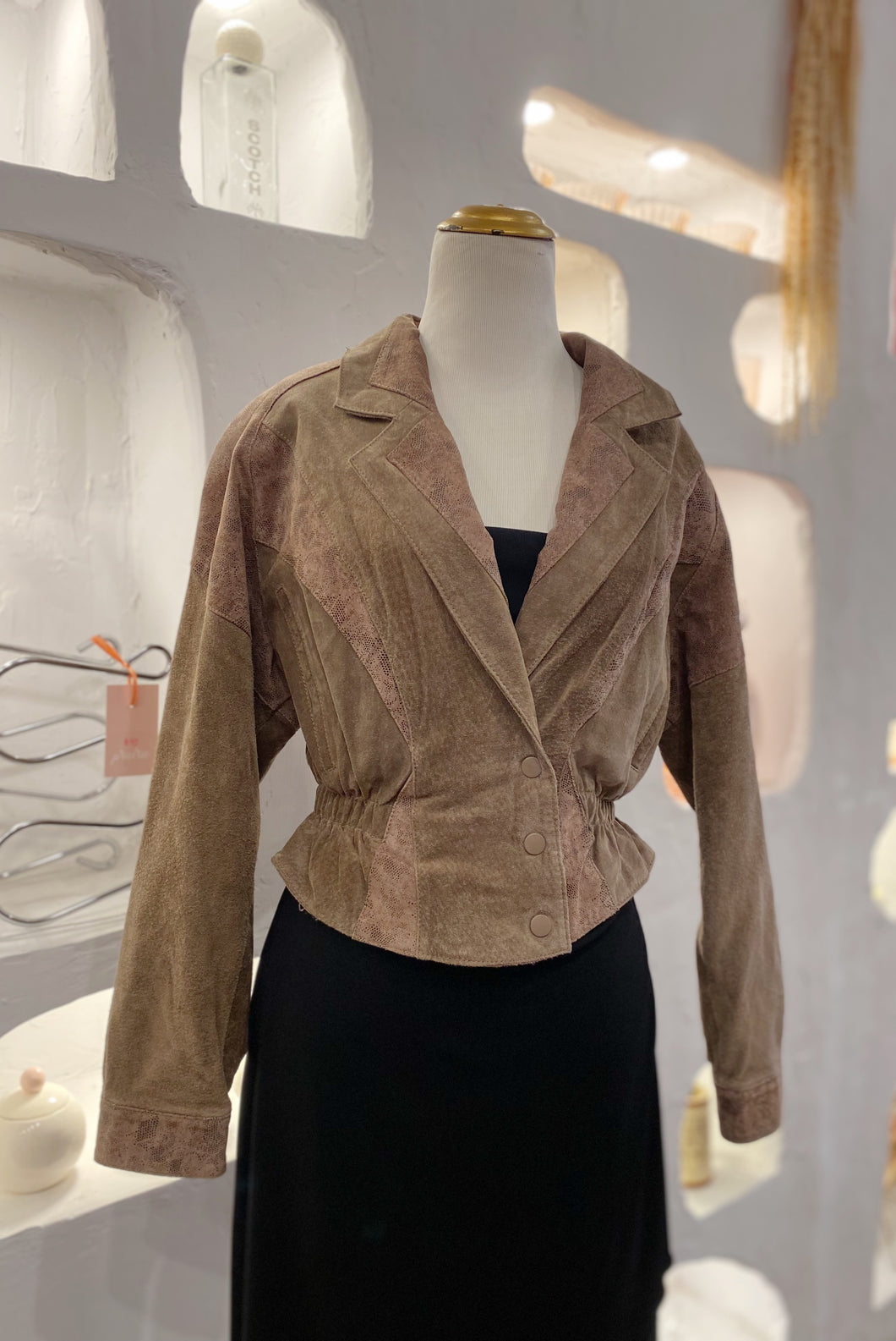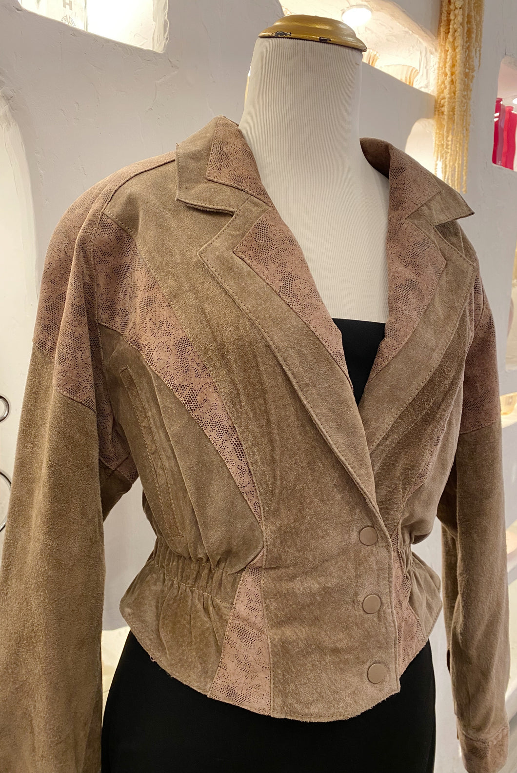 Vintage suede jacket with faux reptile print accents and elastic cinched waist. Has shoulder pads and pockets. Best suits size XS/S.