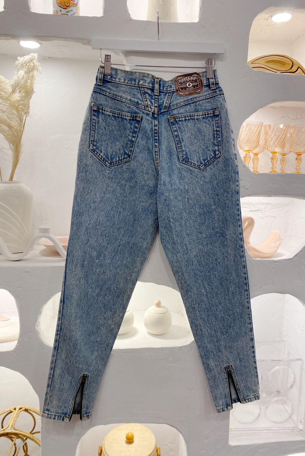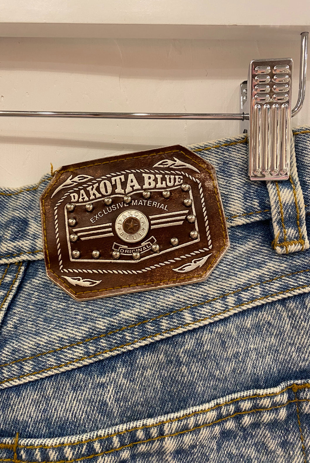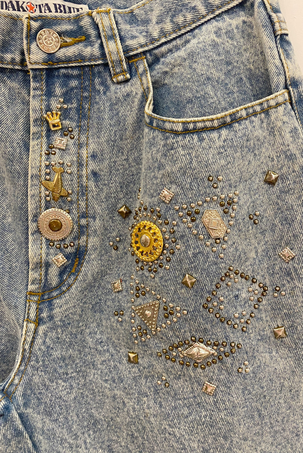 Vintage embellished high rise acid wash jeans by Dakota Blue. Has zippers on the back of ankles. Made in Hong Kong.