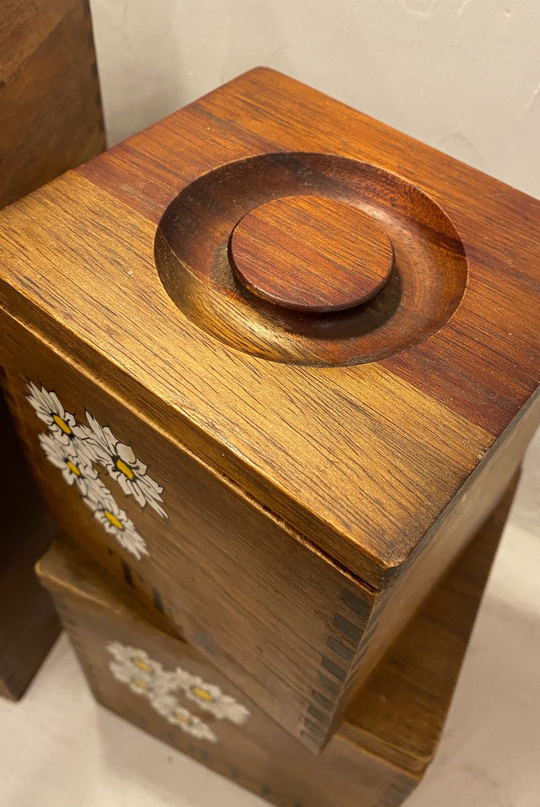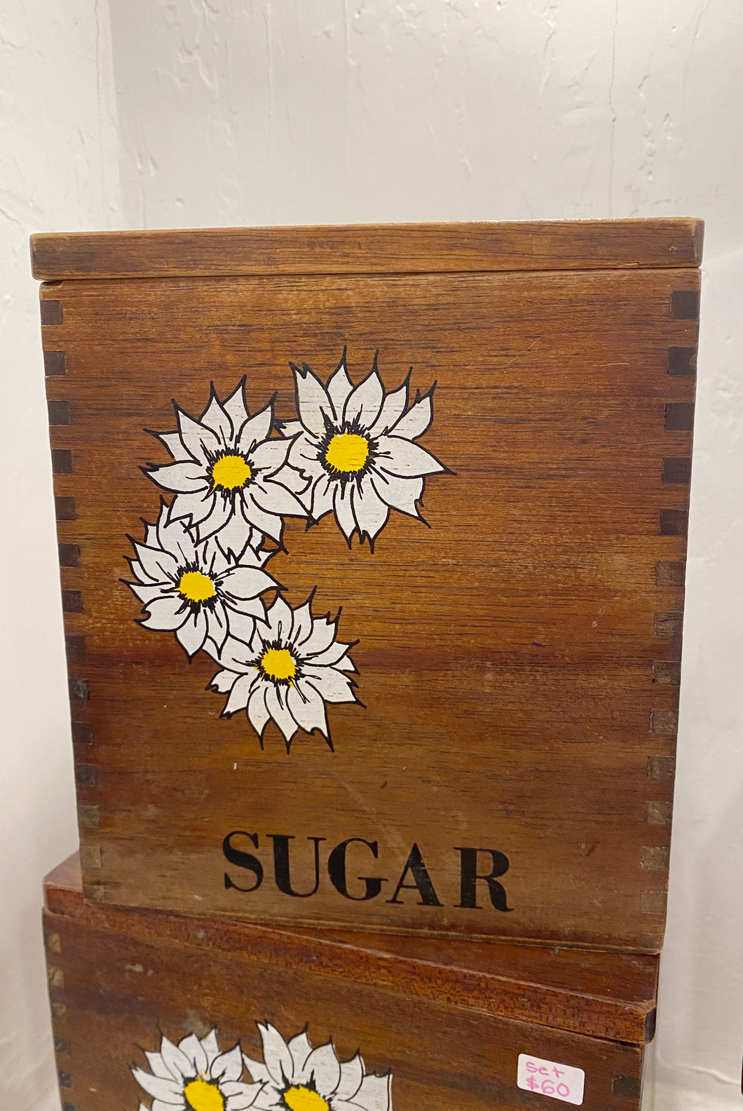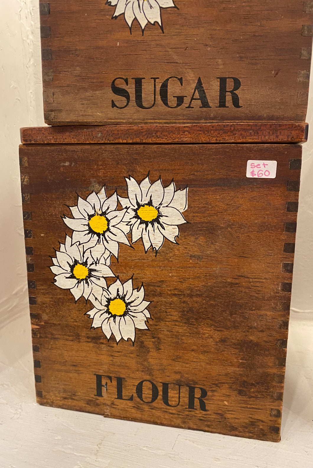 Vintage nesting wooden kitchen canister storage set with daisies.