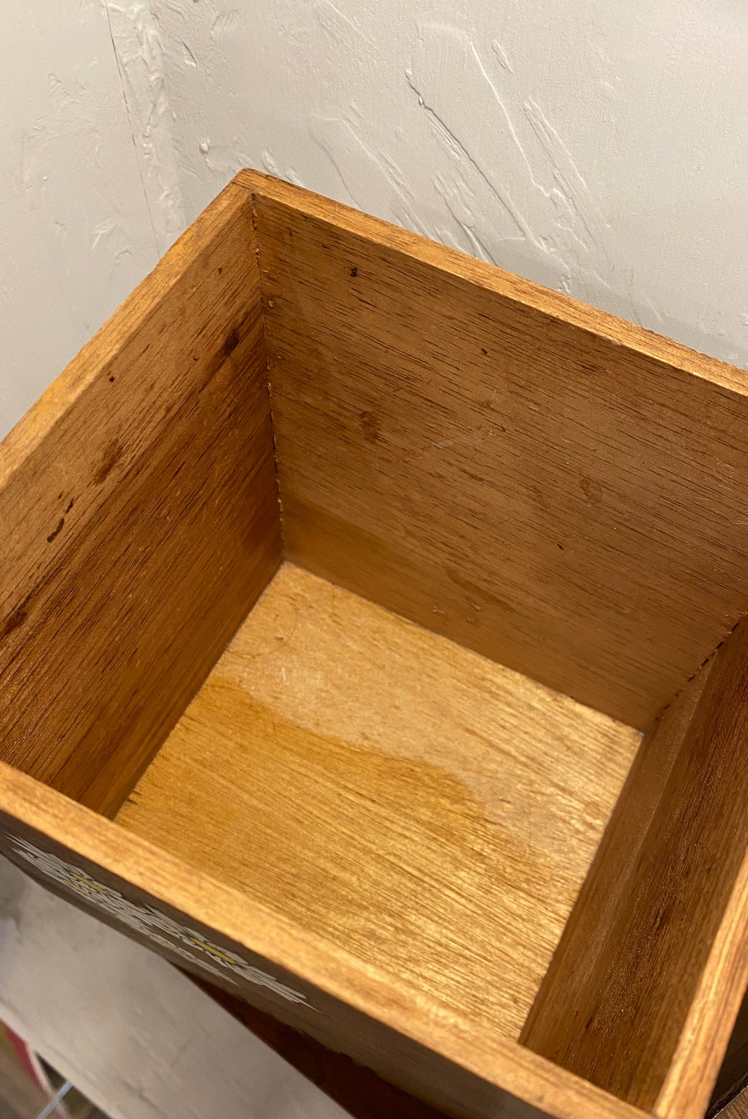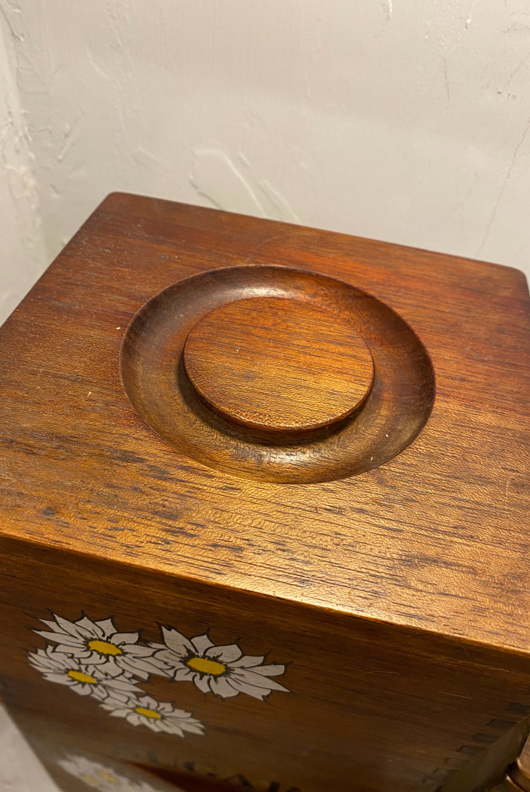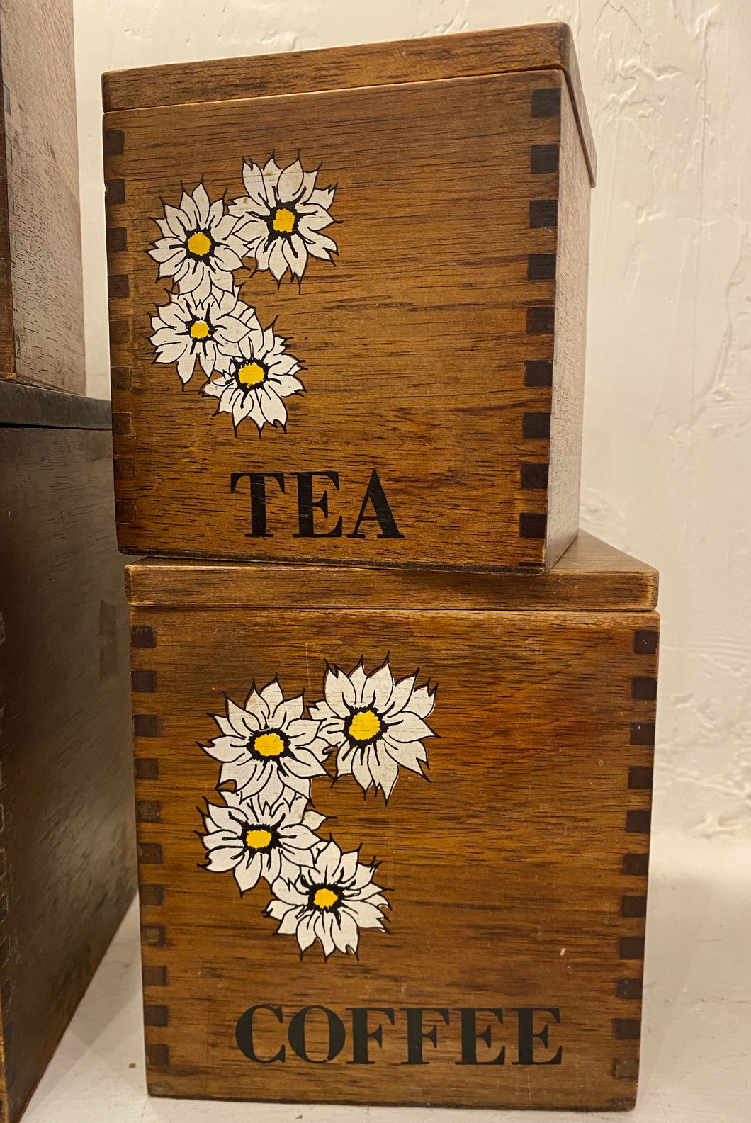 Vintage nesting wooden kitchen canister storage set with daisies.