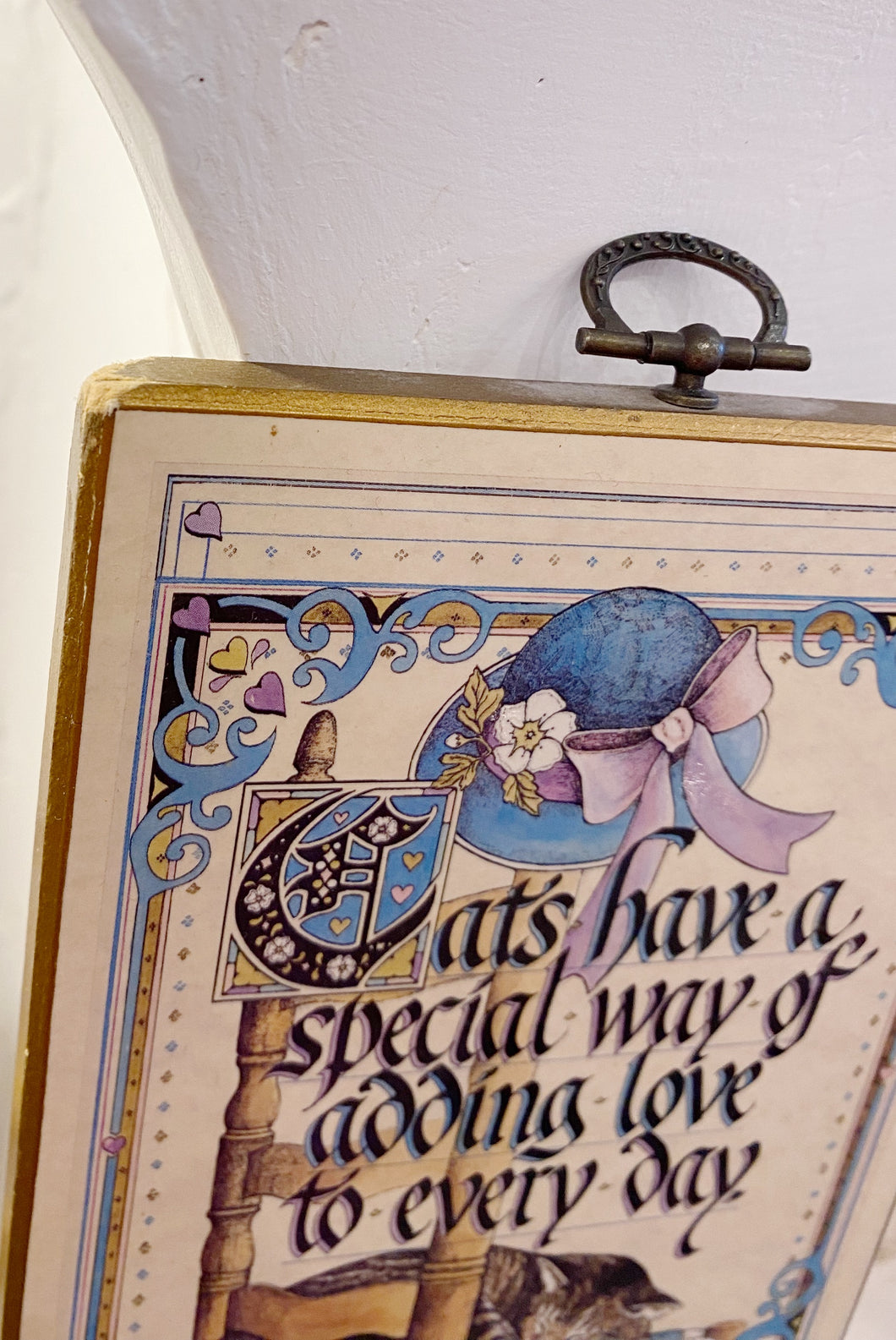 Vintage cat lover’s wall hanging with art by Sydney Hauser. Made by The Cat House Inc in Canada