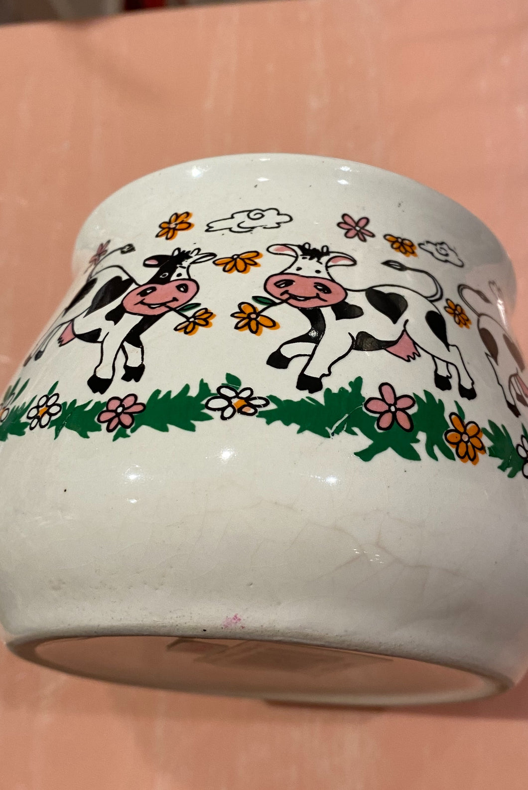 Retro cow themed soup bowl/mug by Verrerie Empire Trading Inc. Made in China.