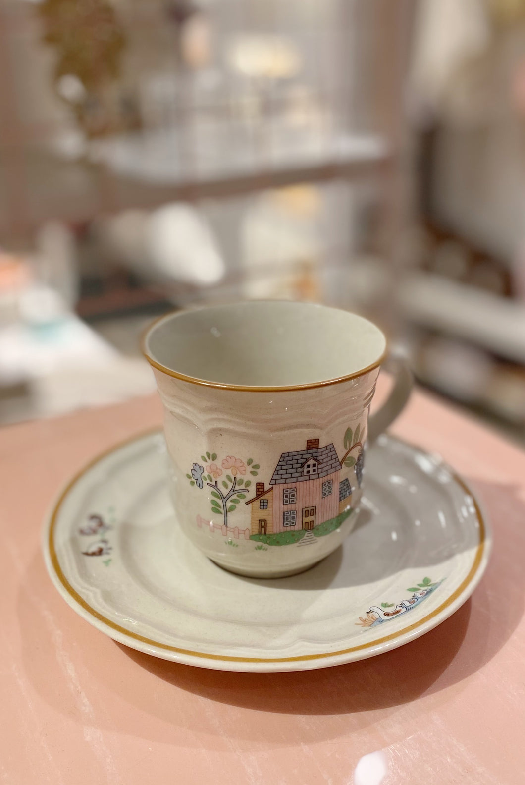 Vintage stoneware tea cup and saucer with farm illustrations. Oven, microwave, freezer and dishwasher safe. Made in Japan.