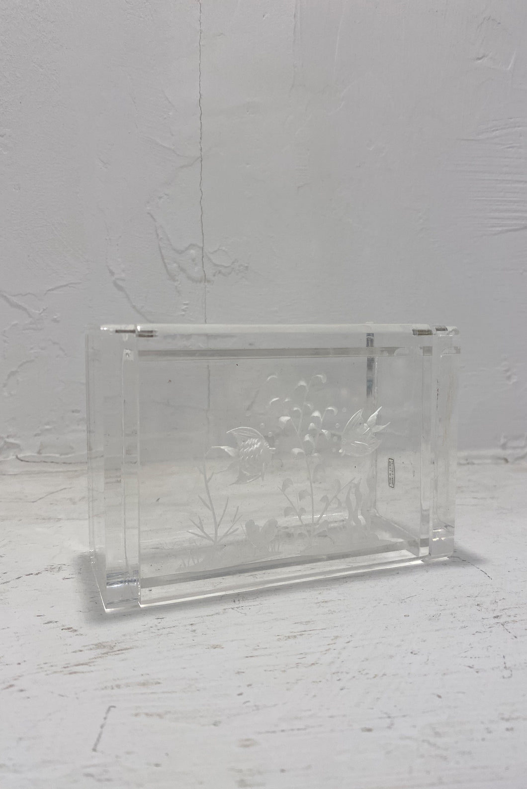 Vintage acrylic jewelry box with hinged lid and etched fish design. Made in Taiwan.