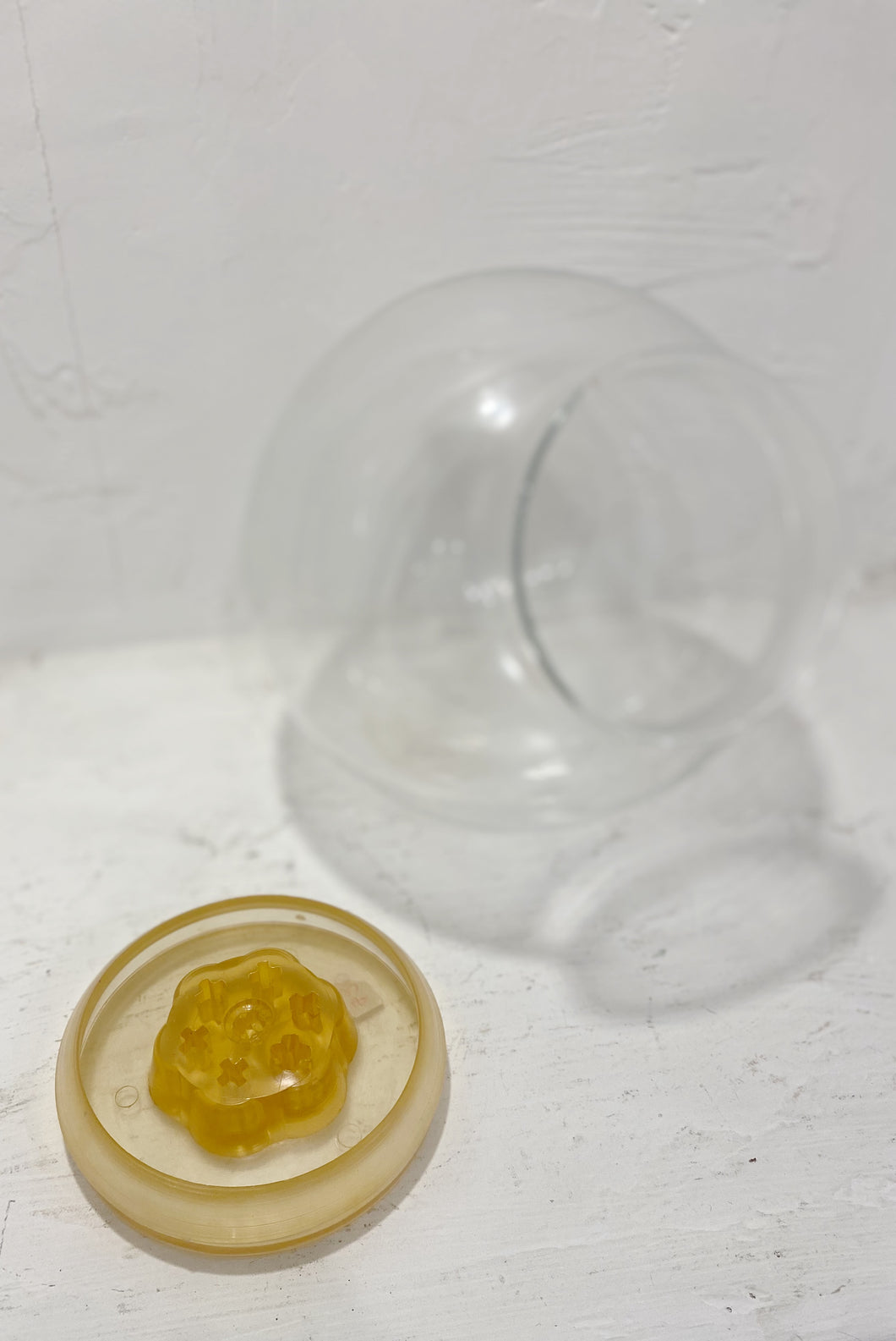 Vintage glass flower aquarium globe with rubber seal. Has a flower frog at the base with holes to hold stems. Meant to be filled with water. Missing original tray base cover.