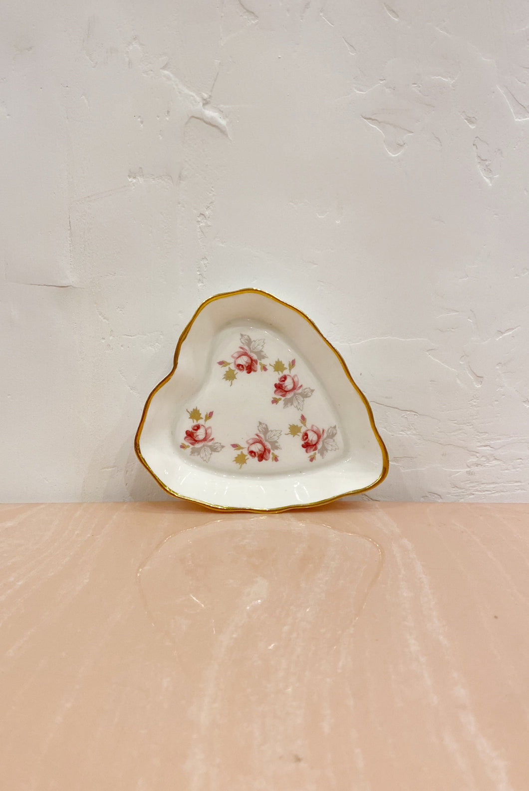 Small vintage heart shaped jewelry or trinket dish with flowers and gold gilding on edges. Canadian Superior Fine Bone China. Made in Canada between 1976 & 1977.
