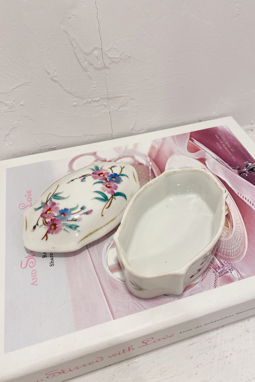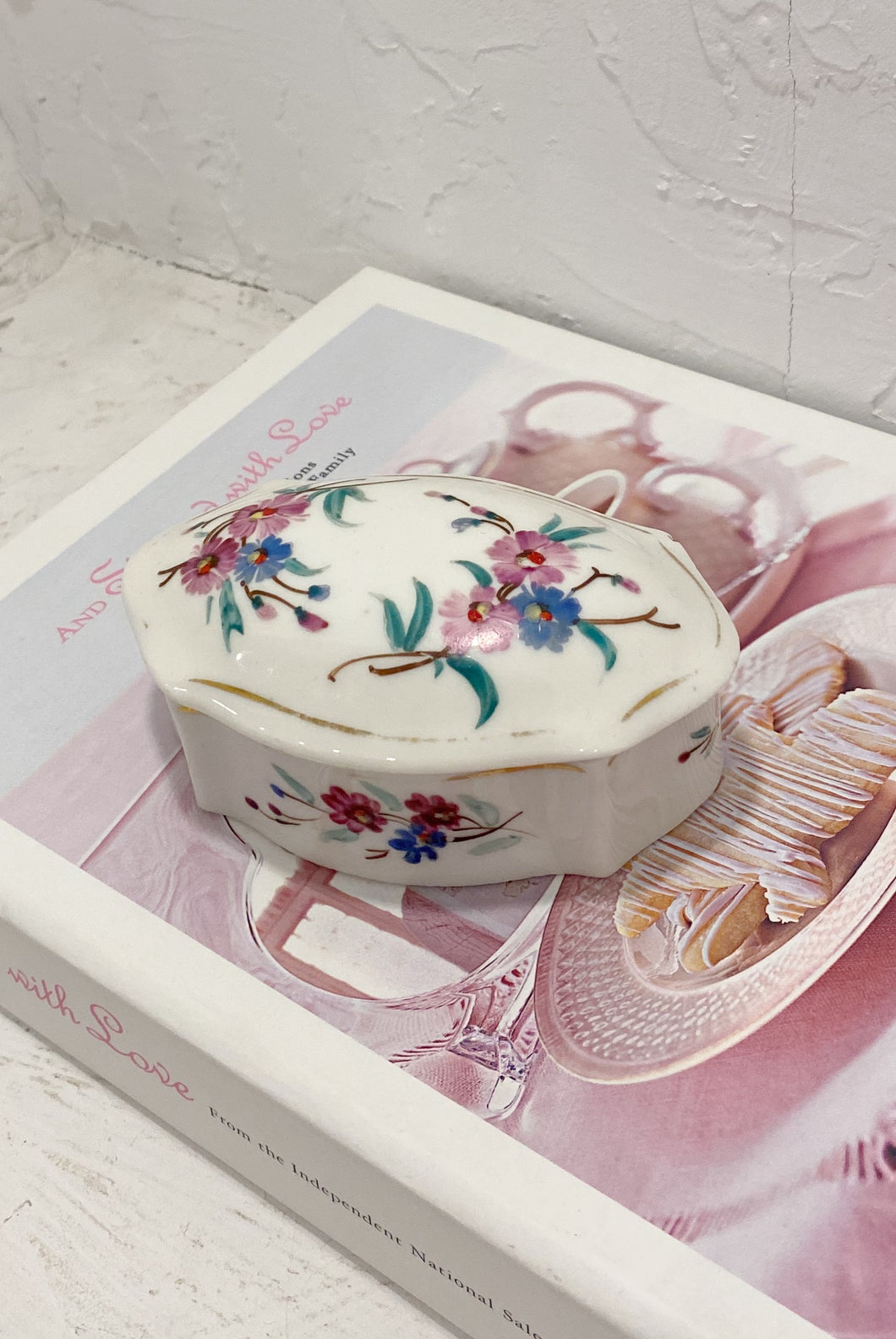 Vintage porcelain floral lidded jar. ‘117’ is written on the bottom in pencil as well as a gold B.