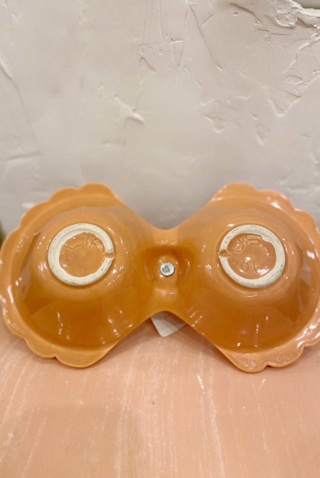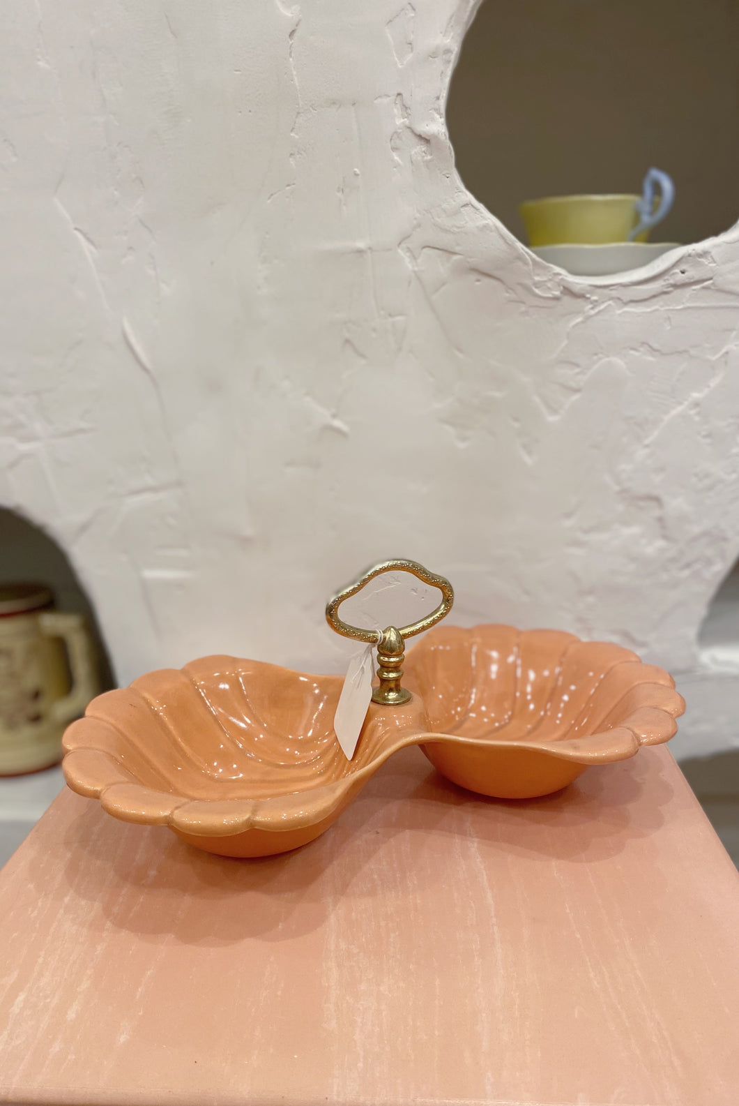 Mid century California Pottery peach divided bowl with gold toned handle. Handle is secure but wobbles a bit. Originally designed for nuts, candy or relish however it would also work great for jewelry or as a catchall dish.