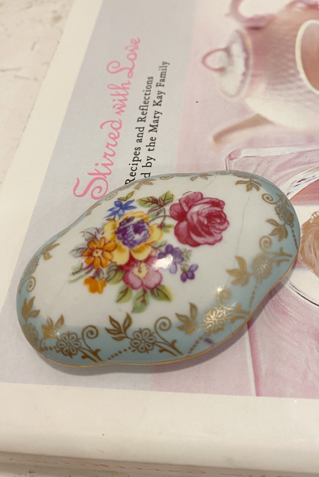 Little vintage floral trinket jar with gold detail. Bottom is stamped ‘Best China Foreign, 16’.