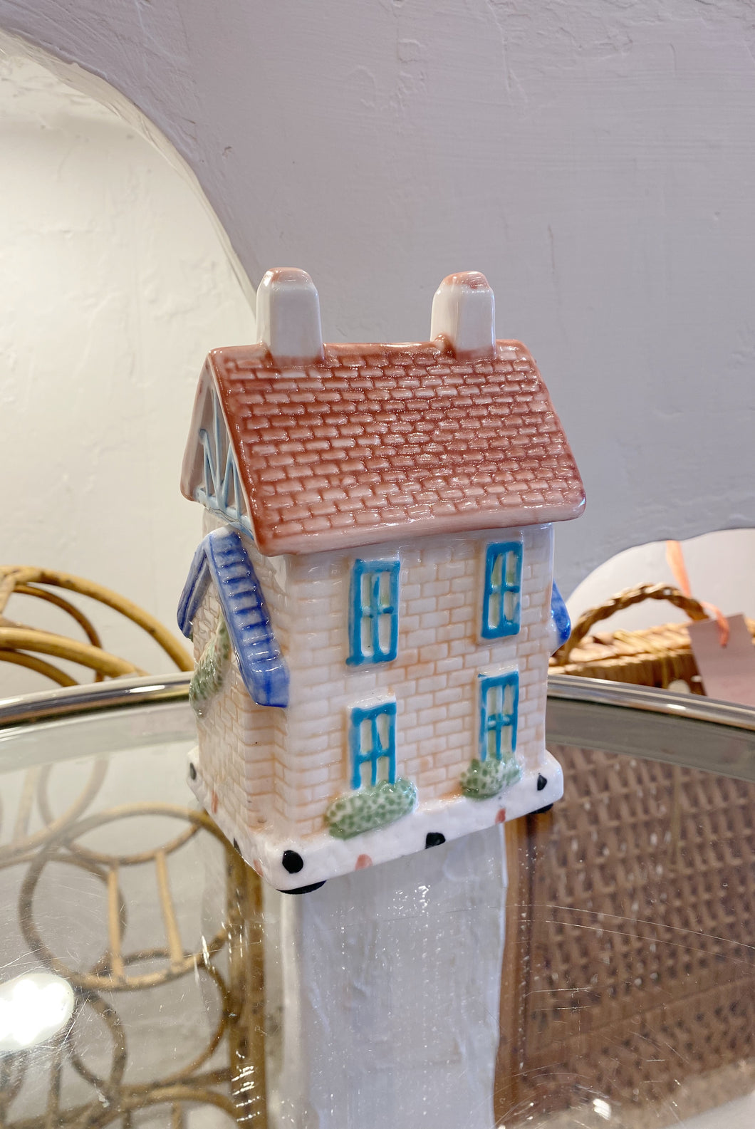 Vintage hand painted house shaped tea canister. Made in China.