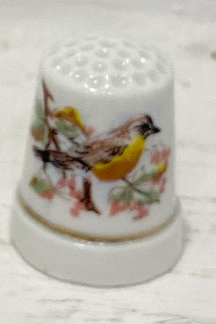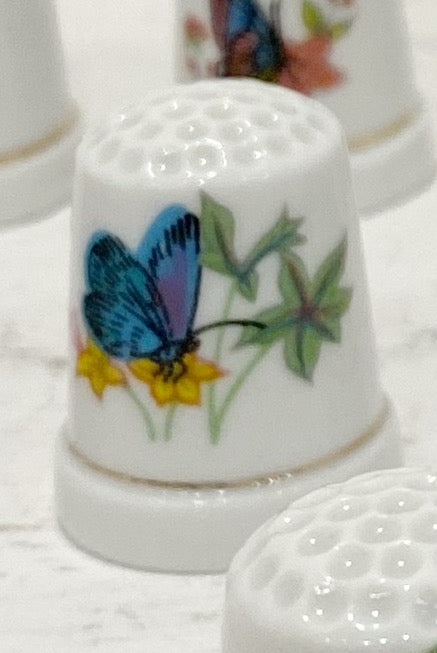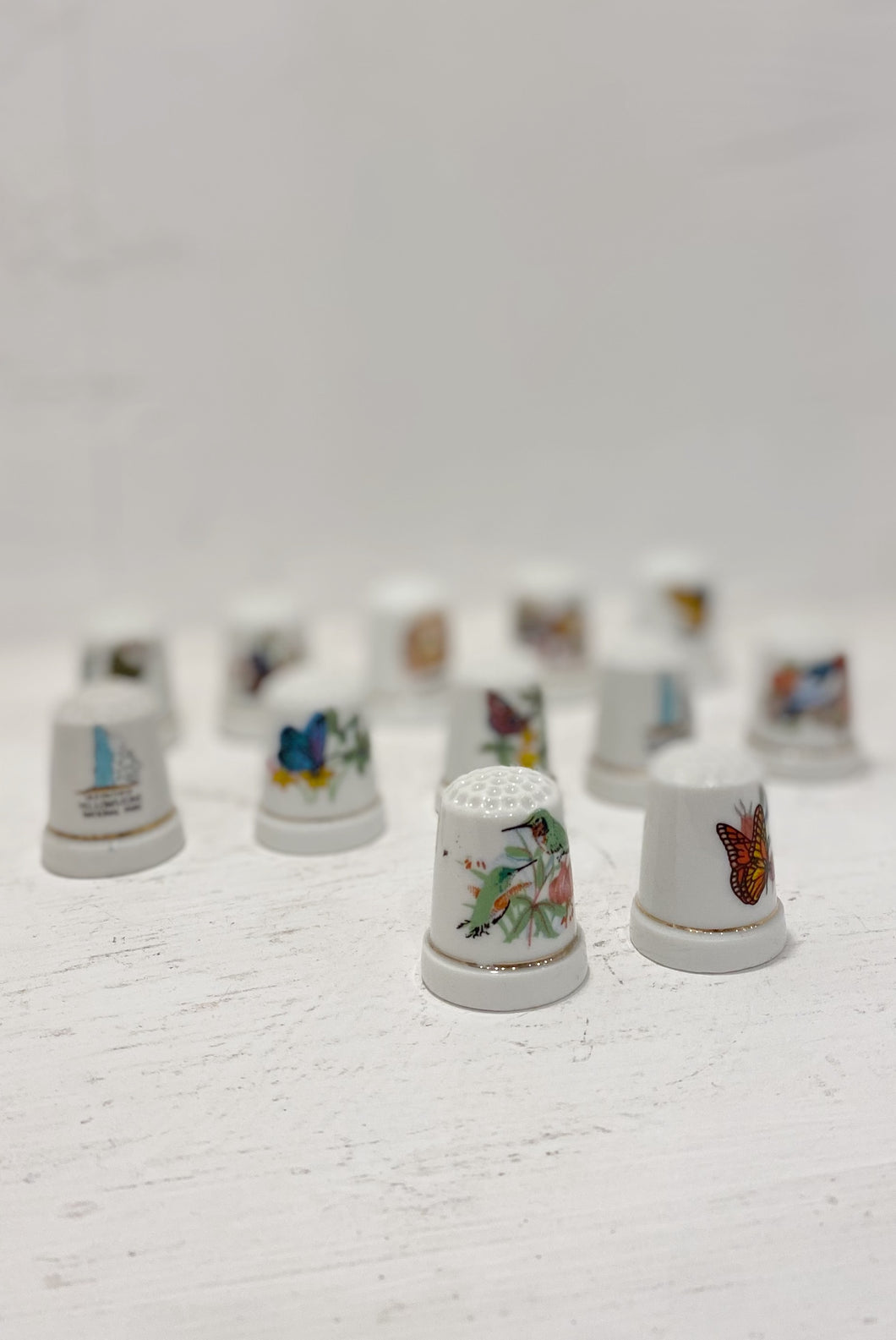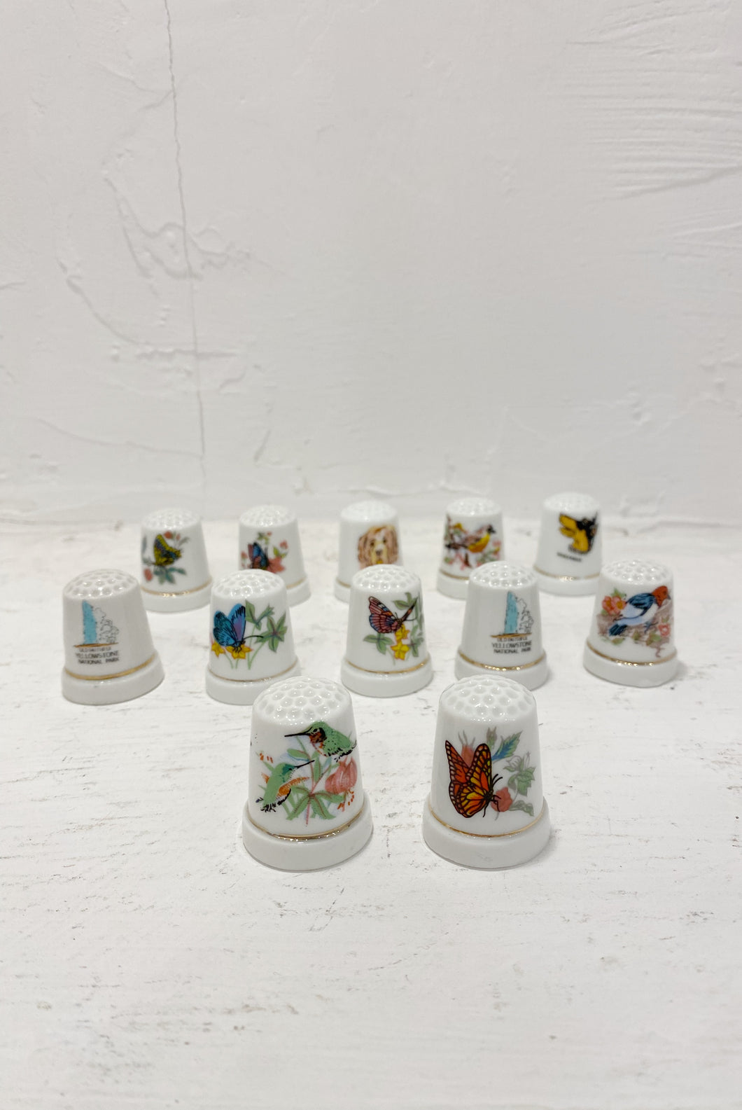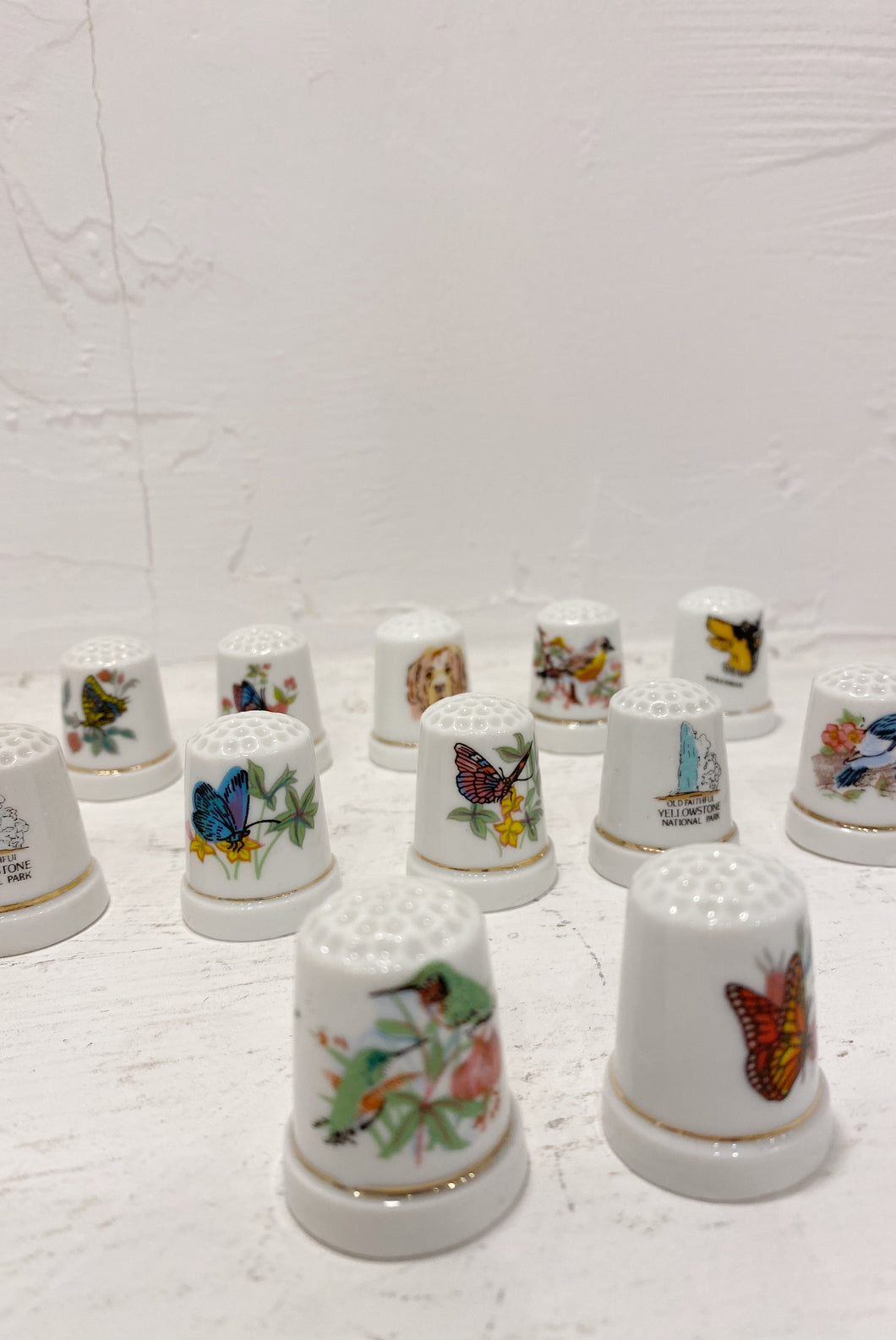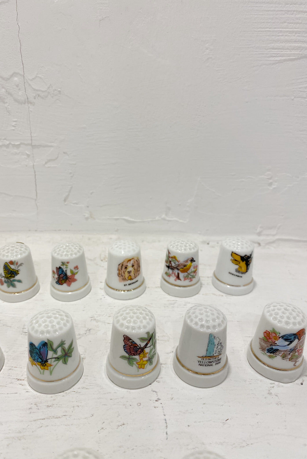 Vintage porcelain thimbles with gold-gilded bases. Some have stickers that say Taiwan.