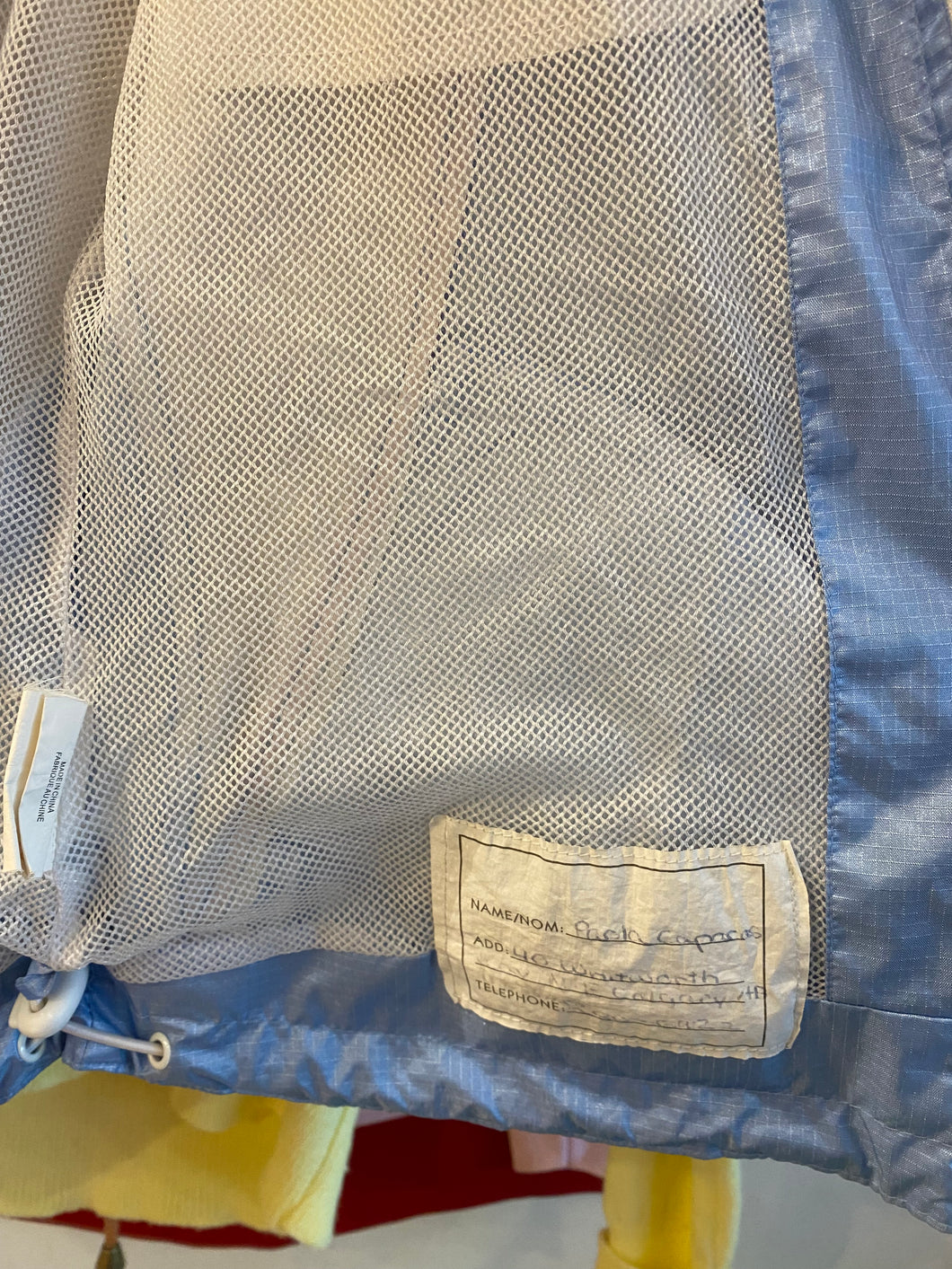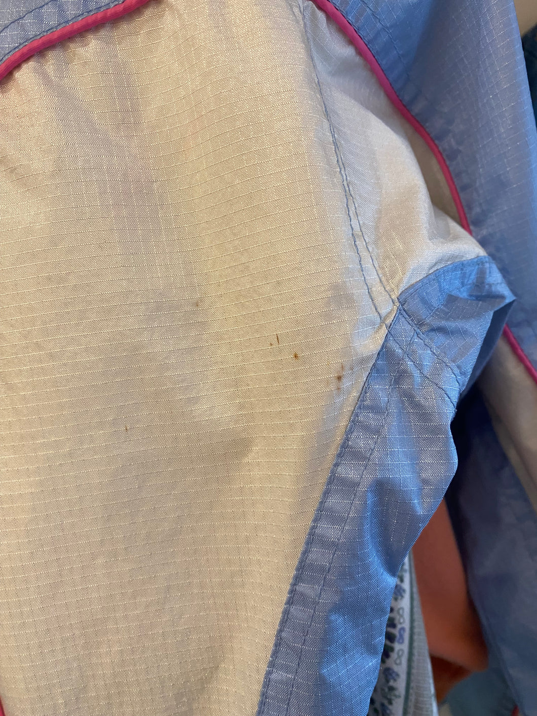 Blue, white and pink windbreaker by Everest Bay. Has mesh lining and drawstrings at inside bottom as well as an inner pocket. Size large. Made in China.