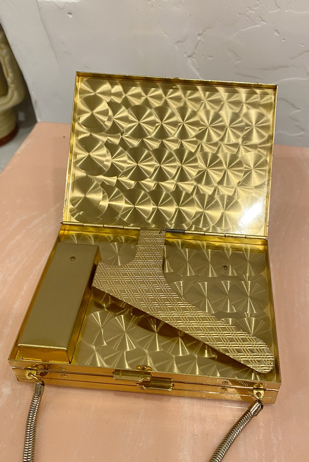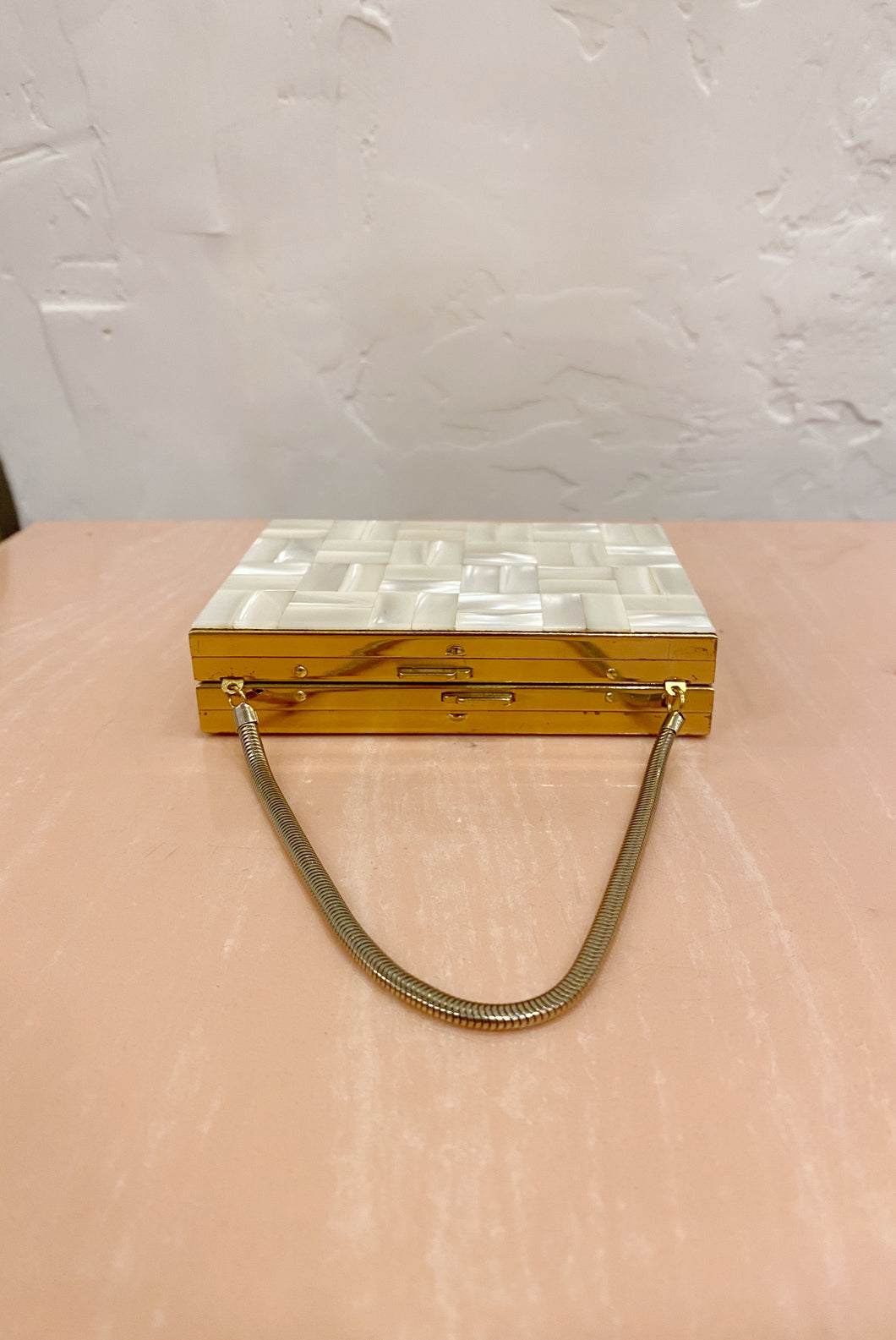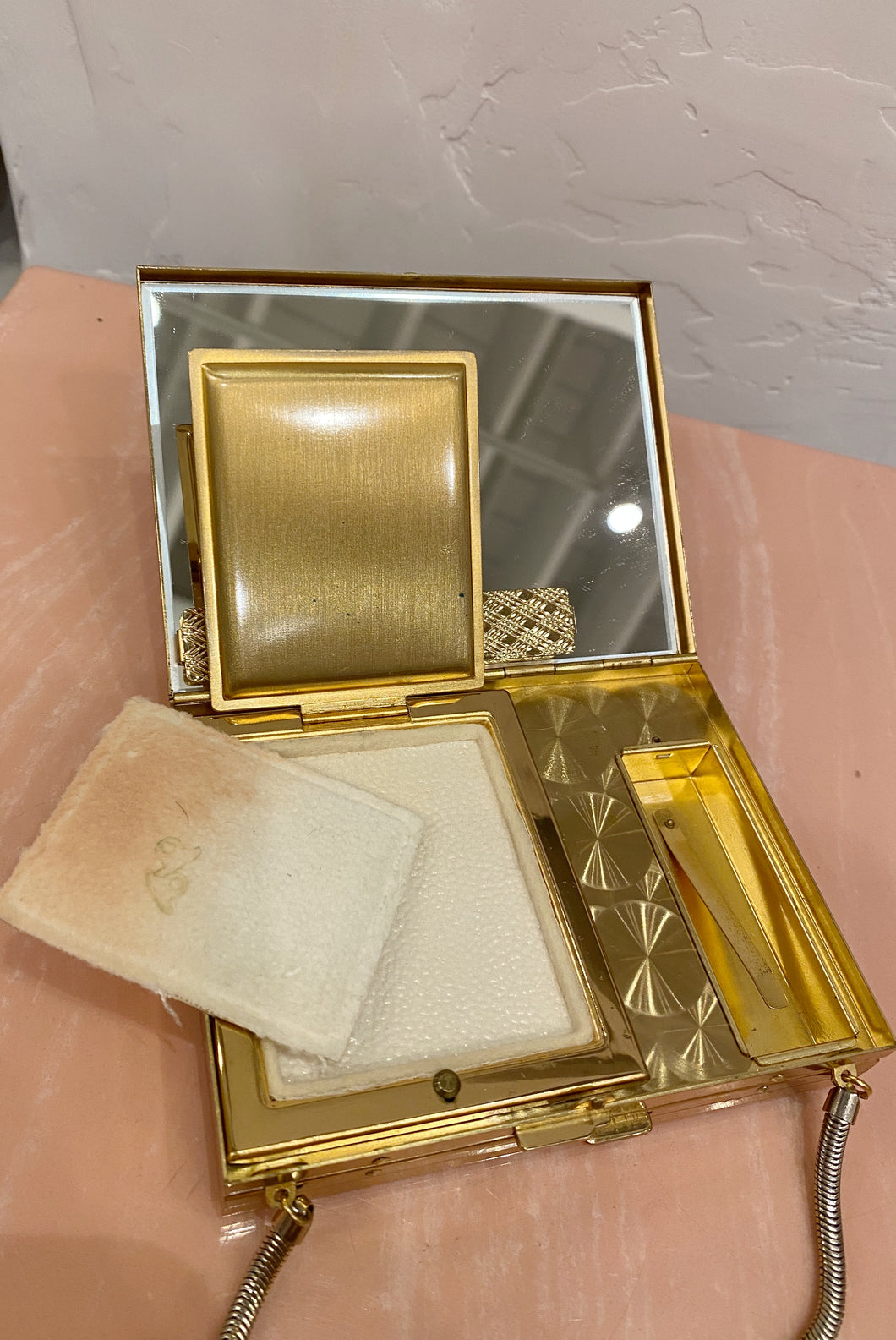 1950s mother of pearl and brass makeup compact and cigarette case with silver chain strap. On the makeup side there is a comb holder (comb missing), lipstick holder with spring and powder well with original powder puff. On the other side there is a hinged arm to hold cigarettes. Inscribed on the back: