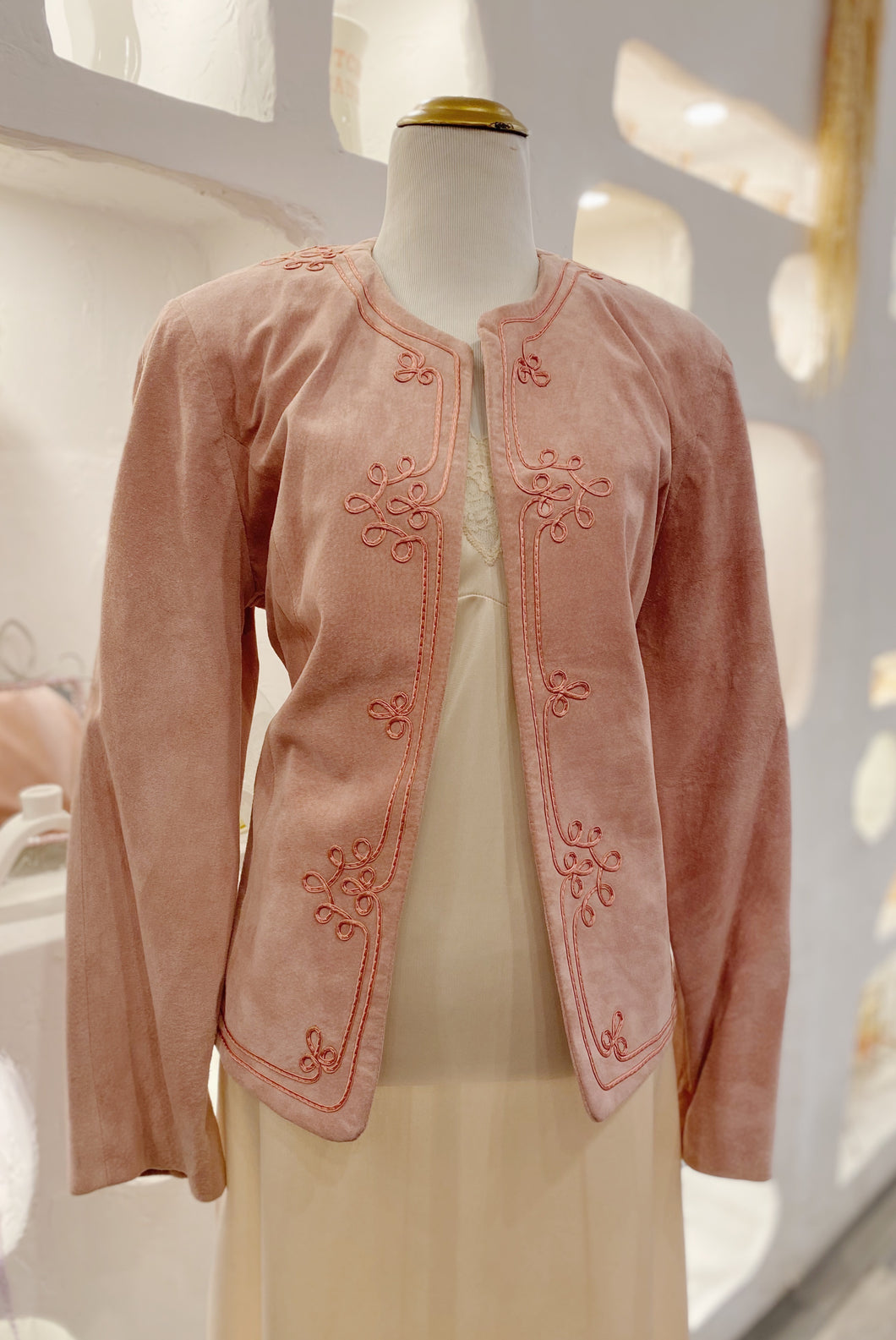 Evan Davies vintage suede jacket with embroidery abs large built in shoulder pads. Has no front closures. Made in Korea. Size 10/Large.