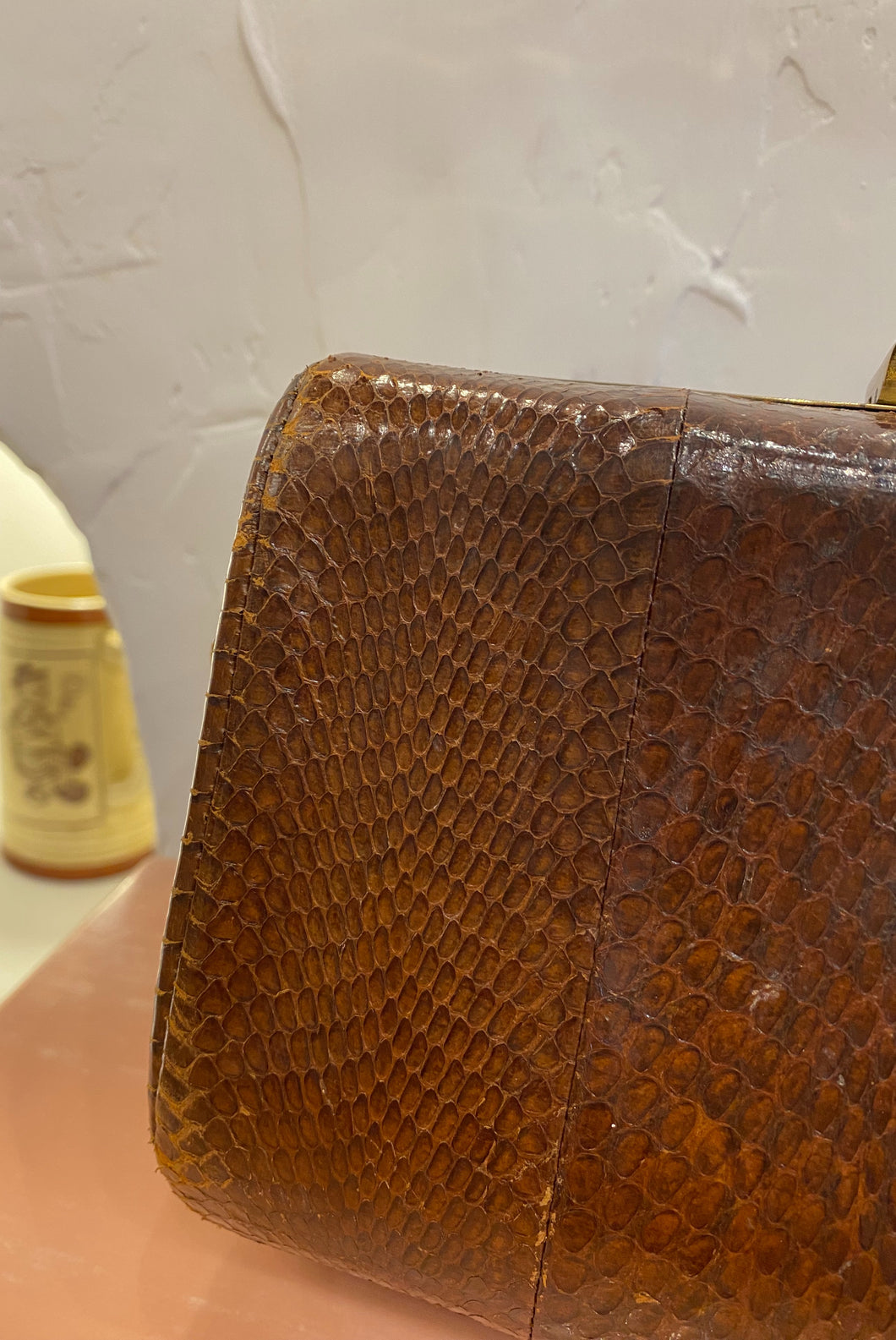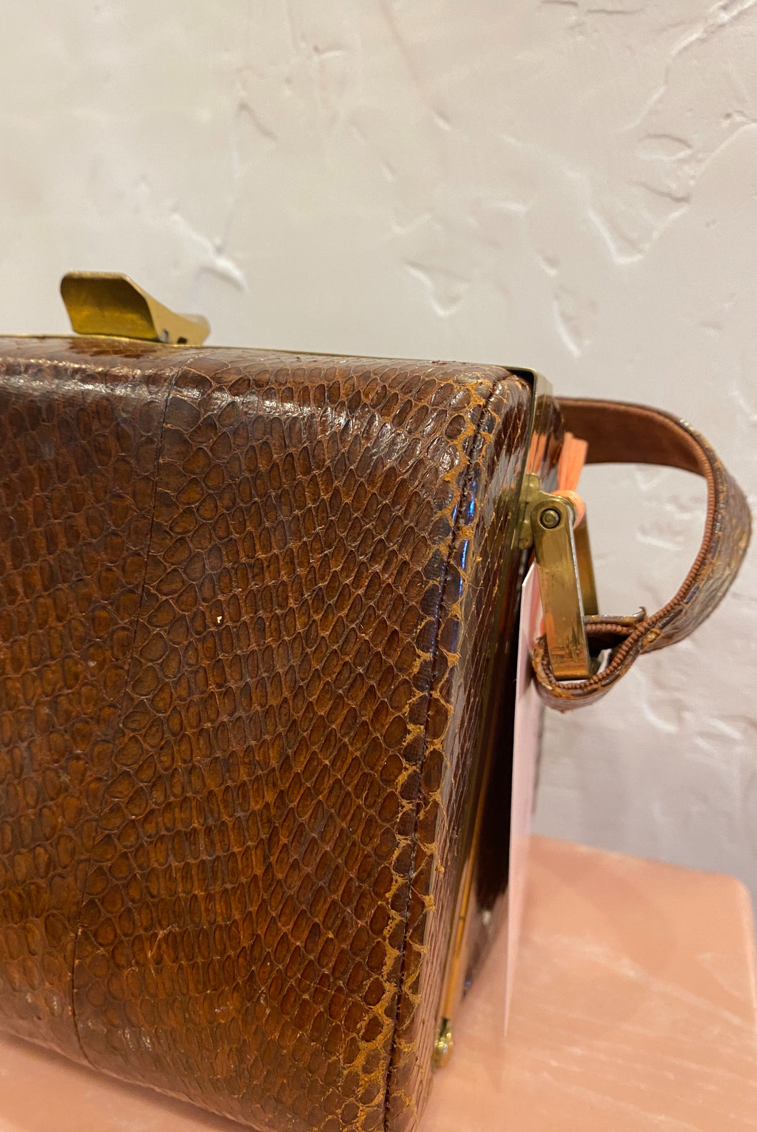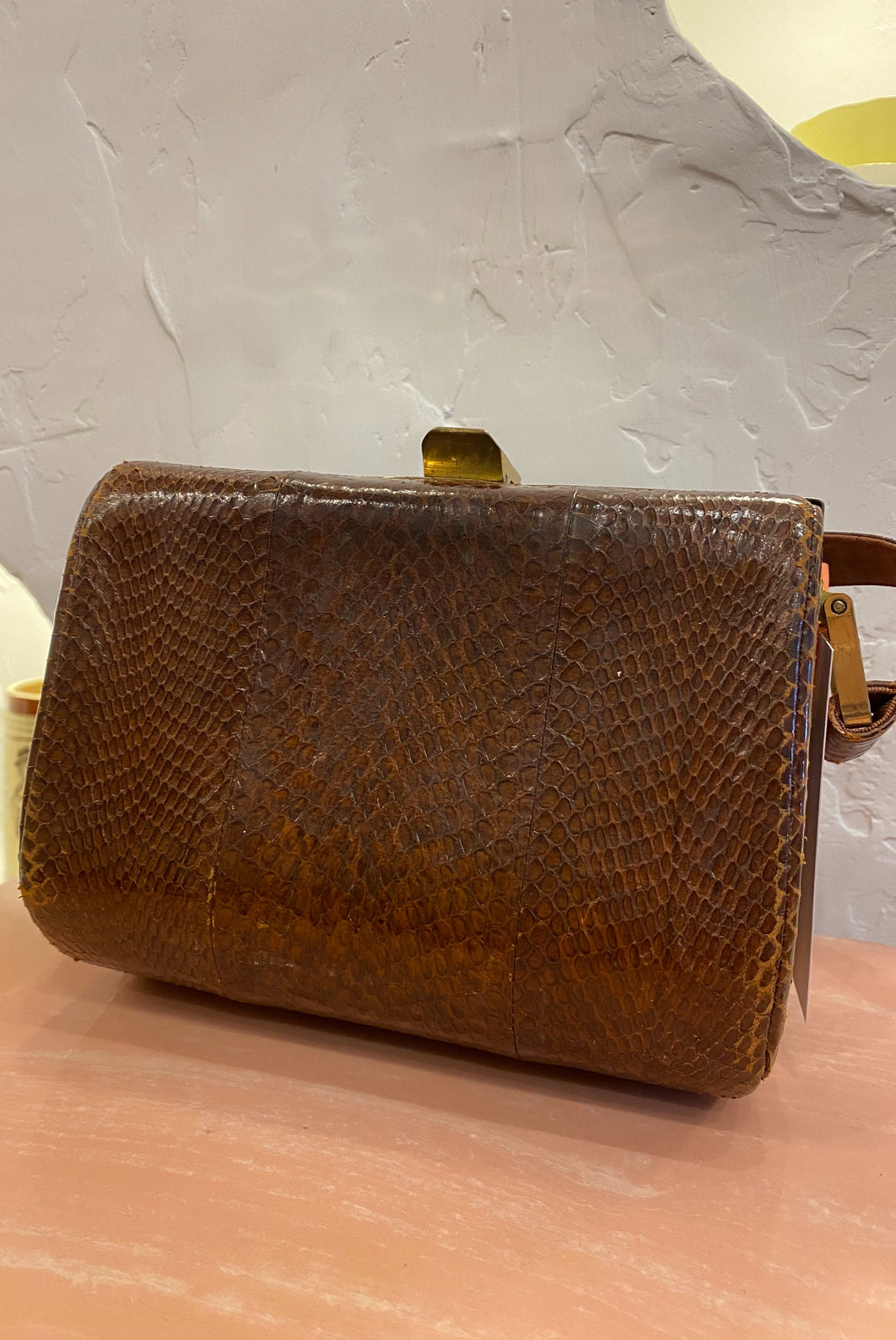 Mid century vintage structured boxy snake leather handbag. No brands or tags inside. Has a small pocket inside.