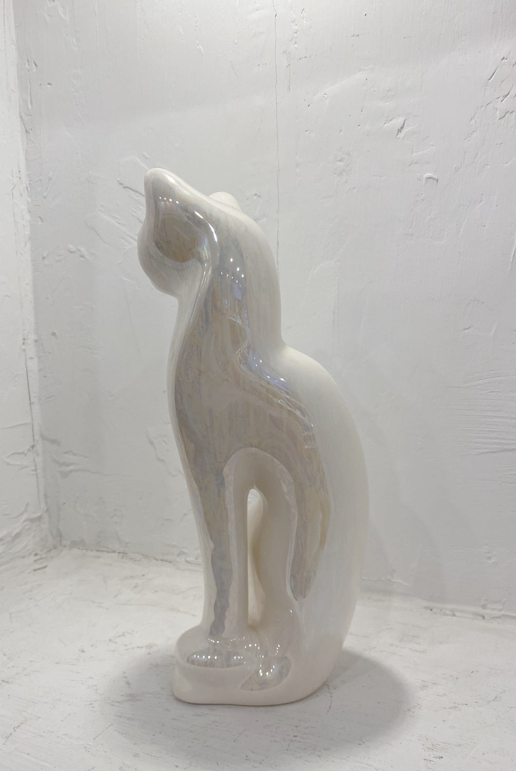 Mid century white iridescent ceramic cat statue.