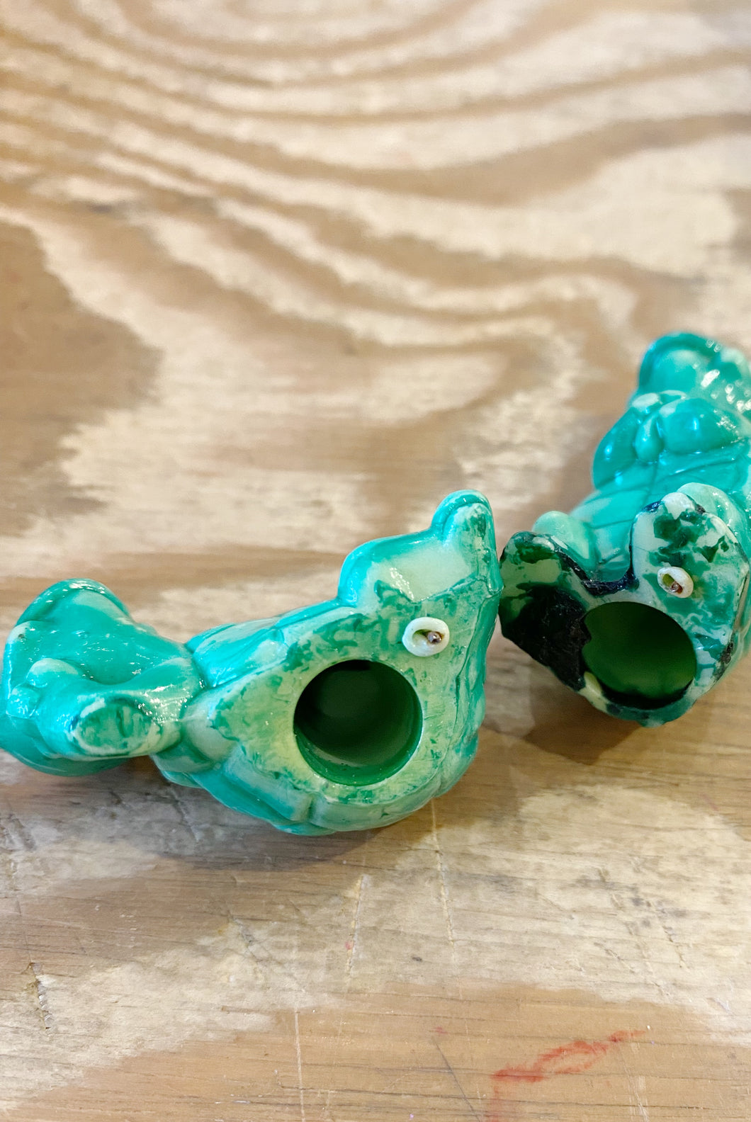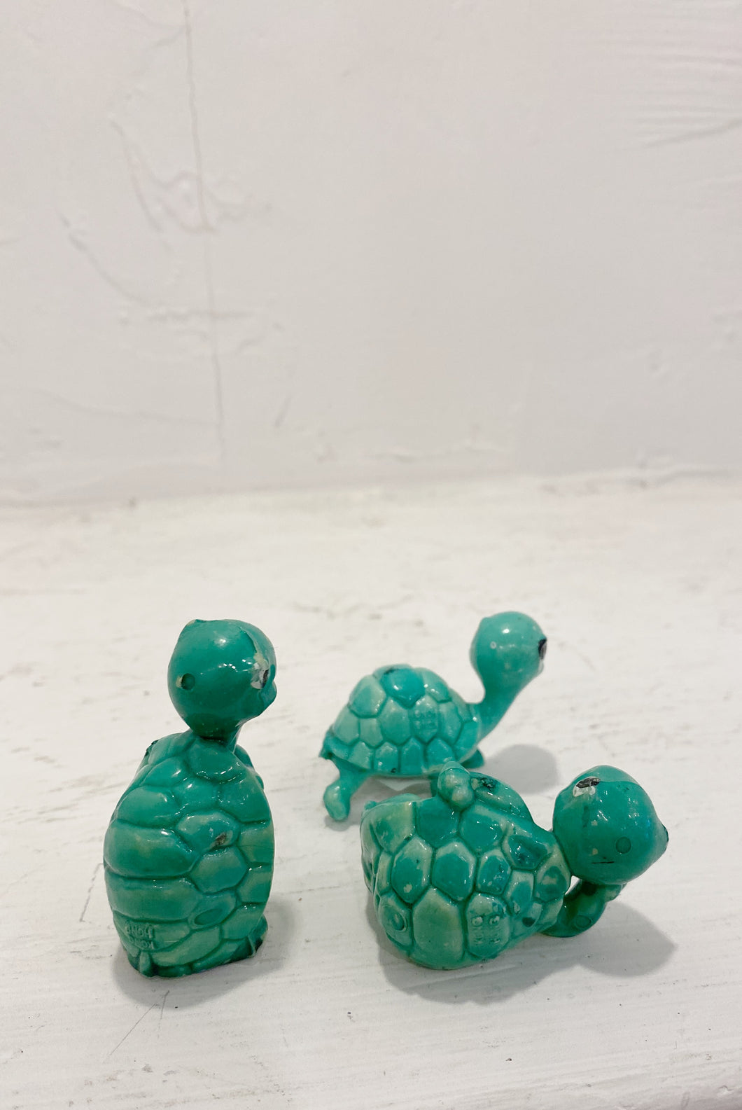 Retro hard plastic, hand painted miniature turtles made for use as terrarium decorations. They are all stamped ‘Hong Kong’ and two have holes in the bottom.